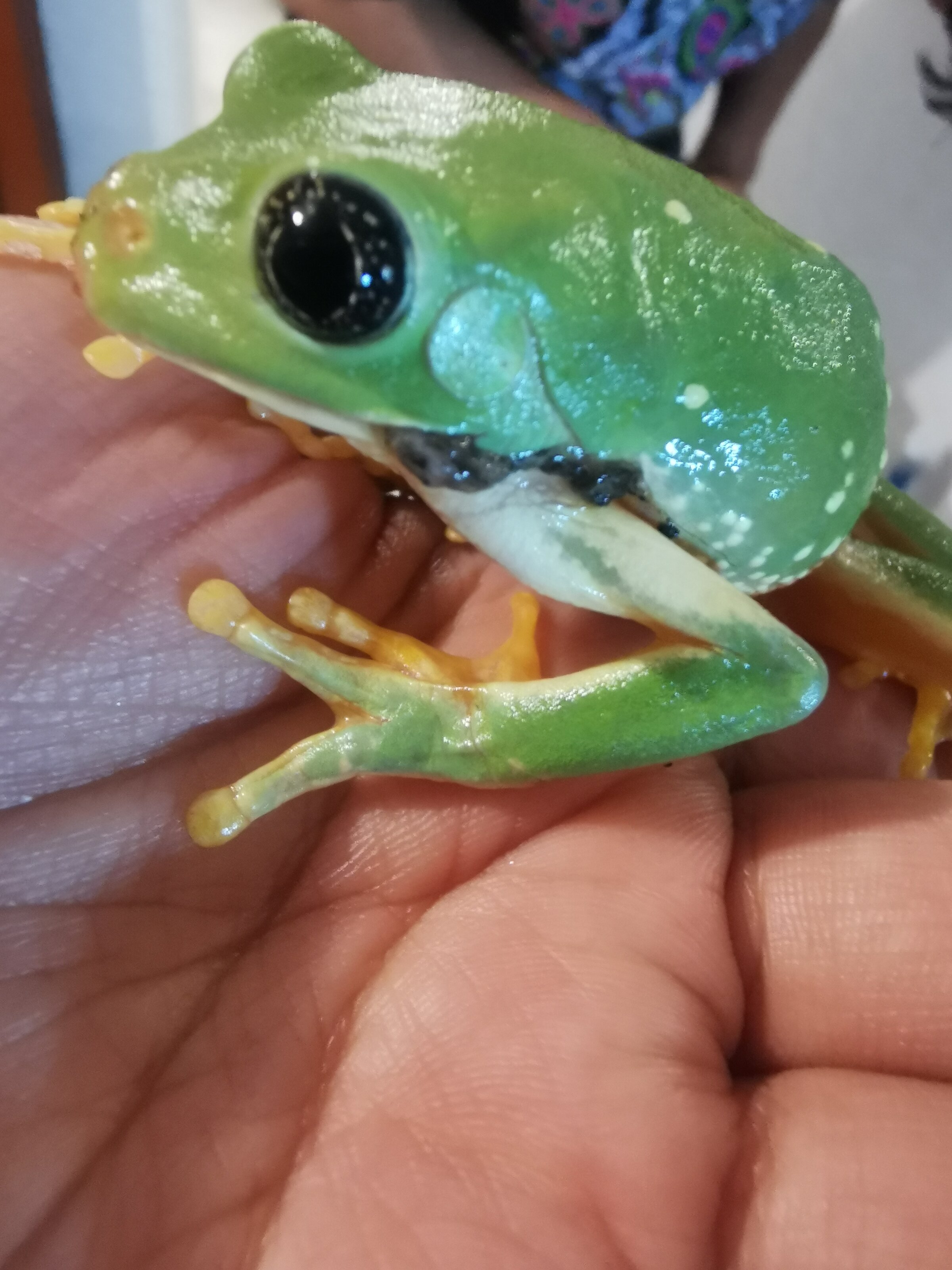 Recién adquirí esta rana el día de ayer, la compre en condiciones no muy buenas para ella, actualmente le estoy tratando fe adaptar un lugar apropiado, el punto es que no ha querido comer y hoy vómito algo extraño... Bueno, las ranas no vomitan así que se me hizo extraño que escupiera eso jsjs... Tienen idea de que es(?