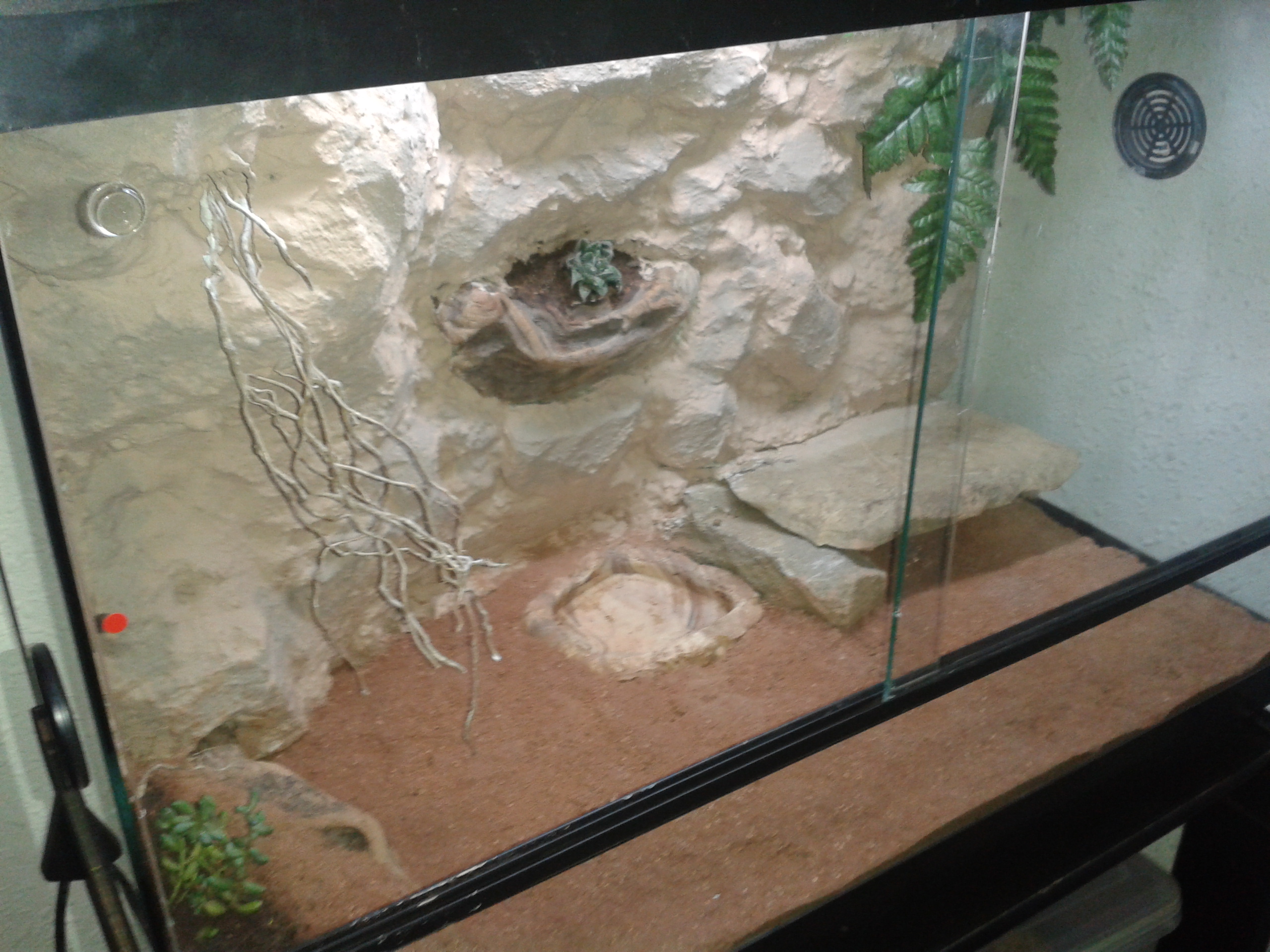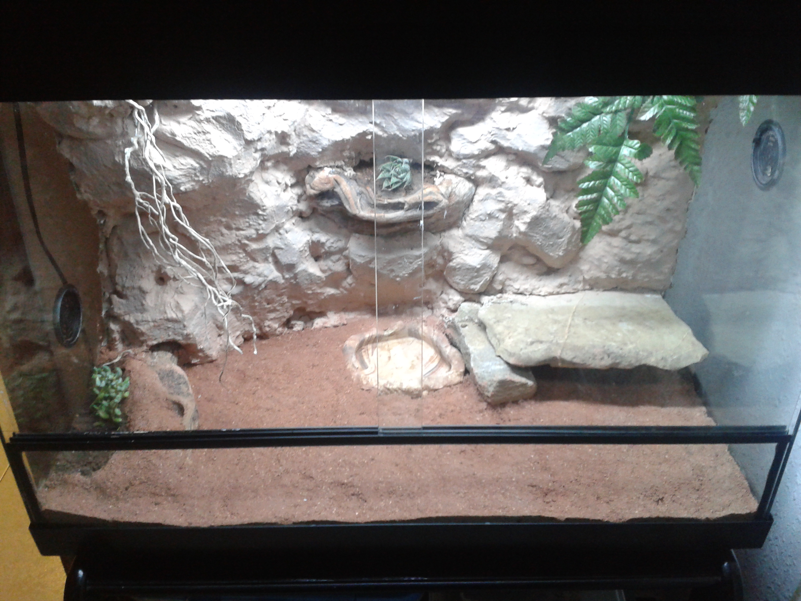 Por fin he acabado mi terrario desértico :es para un gecko leopardo ,el terrario es de 60x30x40.El fondo lo he echo con espuma de poliuretano y el substrato es excavator de zoomed .