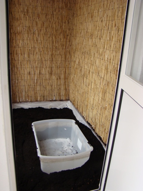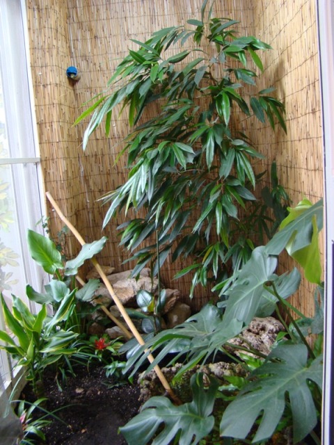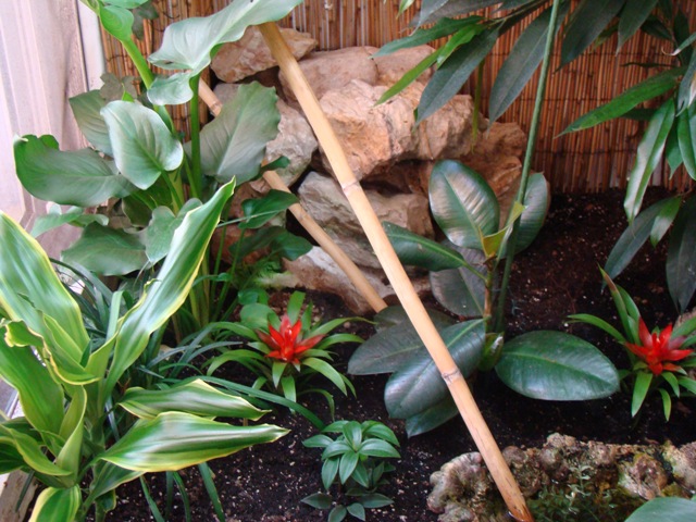 Hola, os dejo estas fotos de mi terrario, en el viven desde hace hace 10 meses mis tres hylas cinereas,son nacidas del año pasado y este año espero que me crien ,son dos machos y una hembra y los machos ya están cantando con bastante frecuencia.La choza donde está el macho es provisional, la puse para probar si la utilizaban y como la toman bien pues tendre que camuflarla o sustutuirla por algo mas rustico, también me gustaría tapizar el suelo con algun musgo pero no se que tipo irá bien. En el terrario también habitan y crían grillos durante todo el año ,por lo que solo con alimentarlos con pienso y lechuga llevo un año sin necesidad de tener que comprarlos. La charca tiene unos 25cm de profundidad.