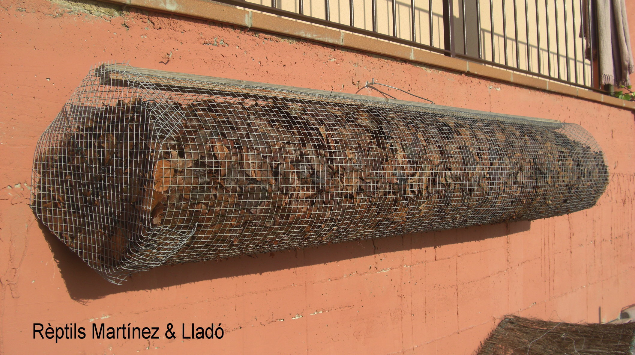 Dispongo las hojas dentro de este tubo de malla de 180 cm. de largo y 100 cm. de diámetro, con capacidad para unos 35-40 kg de hojas (peso sin escurrir, jeje) lo cuelgo expuesto al sol y poco a poco van cayendo toda suerte de bichitos y las temibles crías de escolopendra, causantes de la masacre de crías de milpiés que he tenido antes de usar este sistema.
