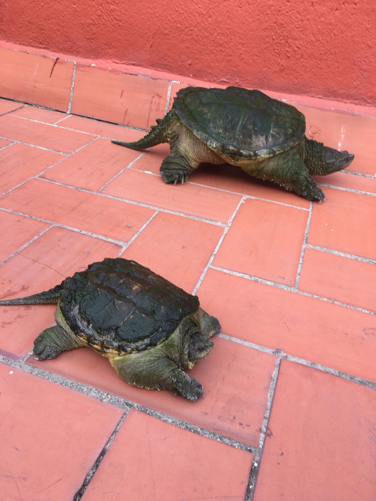 Hola, aquí os dejo fotos de mis 2 chelydras serpentinas, la más grande mide 30 cm de caparazon y pesa 7,800 kg casi 8 kilos y tiene entre 4 a 5 años de vida, lleva hibernando en el exterior desde que media 15 cm, la alimentó unas 3 veces ha la semana con buena cantidad, ha llegado intentar cazar palomas, todo lo que entra en el agua es atacado. La pequeña mide 16 cm de caparazon y 15 de ancho la tengo desde el verano de 2020, pesa 1,500 kg un kilo y medio, muy pesada para el tamaño que tiene, la otra cuando tenía el mismo tamaño pesaba 750 gramos, la alimentación igual que la otra, empezó hibernar cuando tenía un tamaño de casi 12 cm aguantando temperaturas de 0 grados.