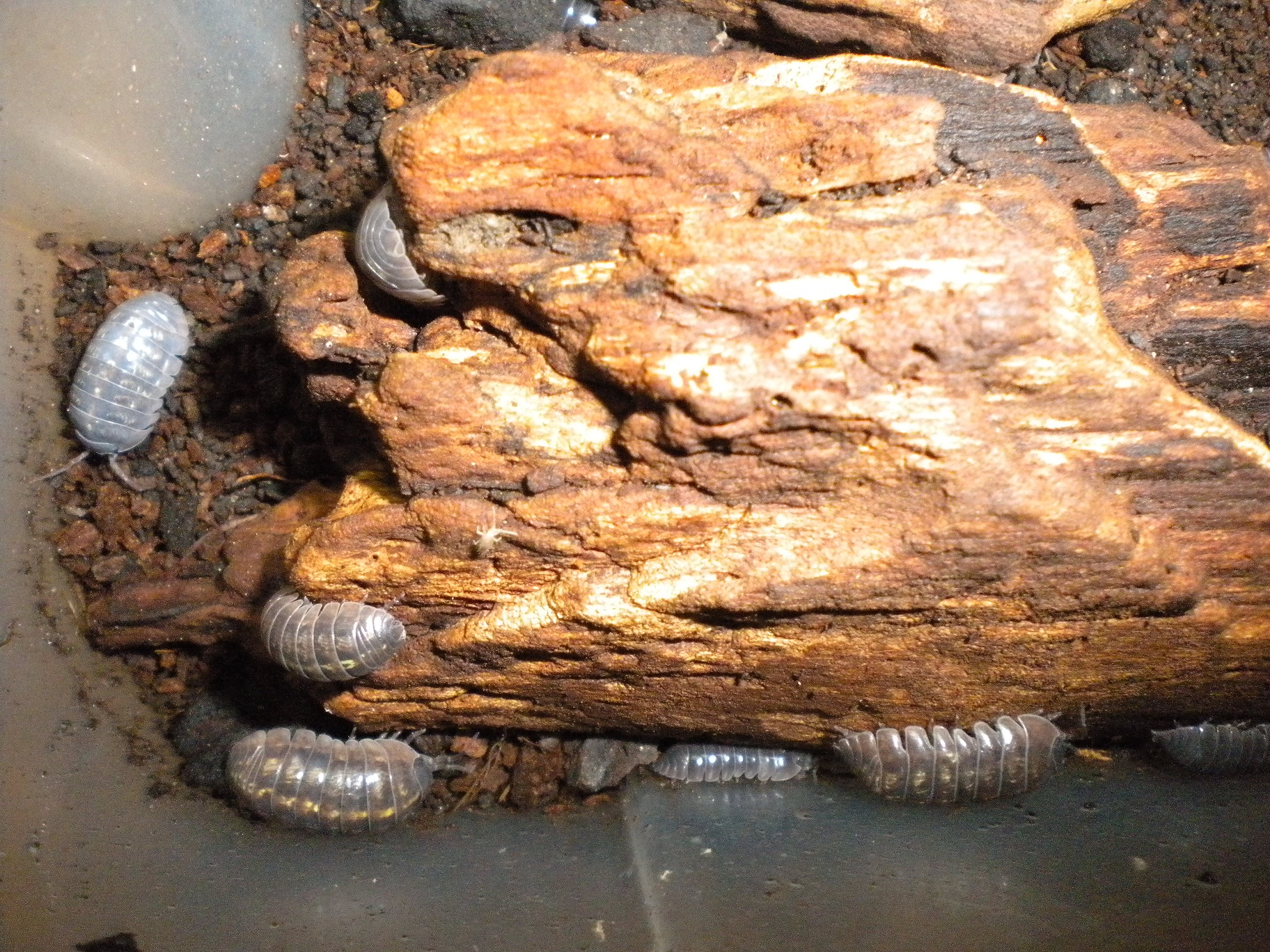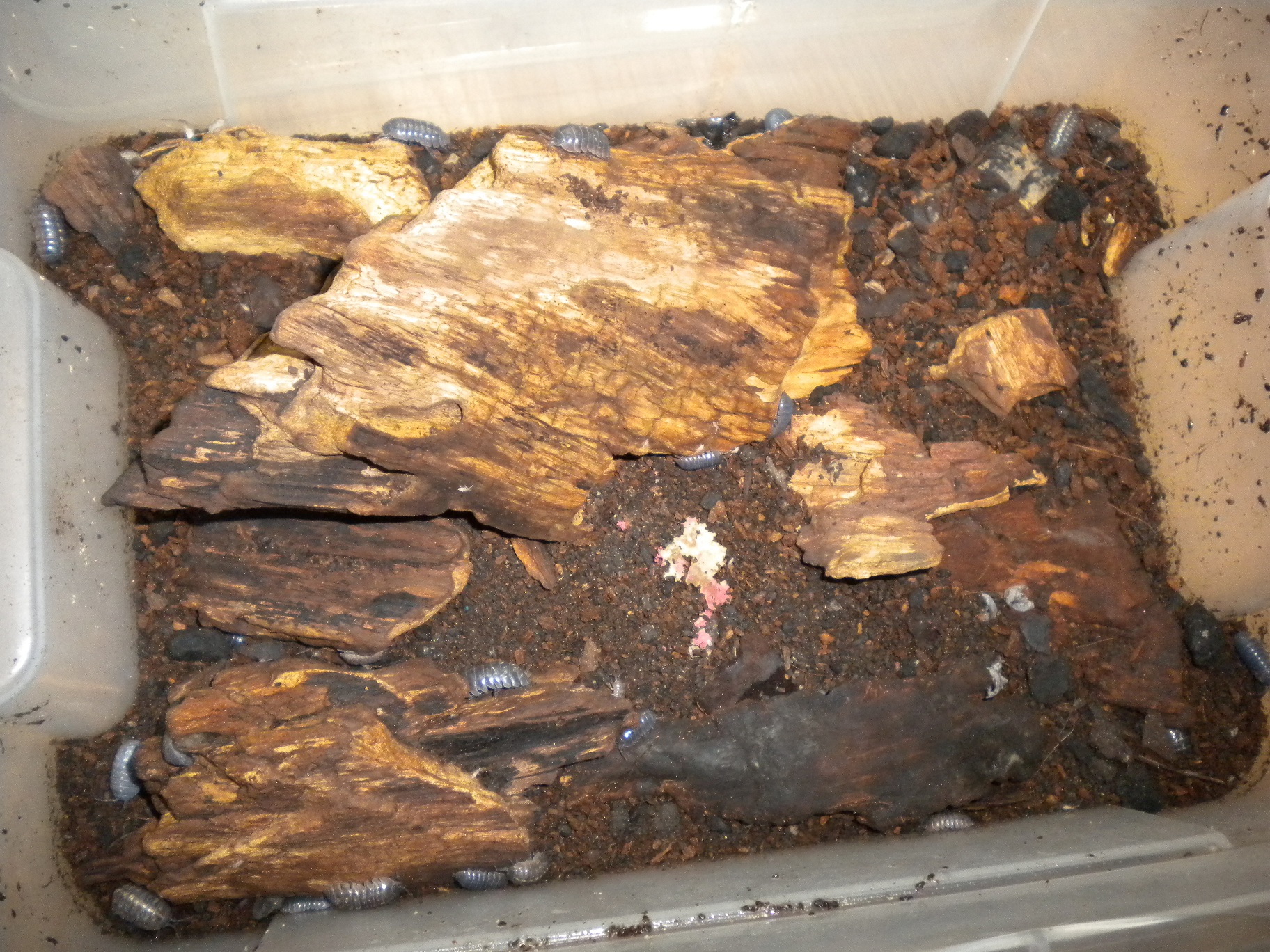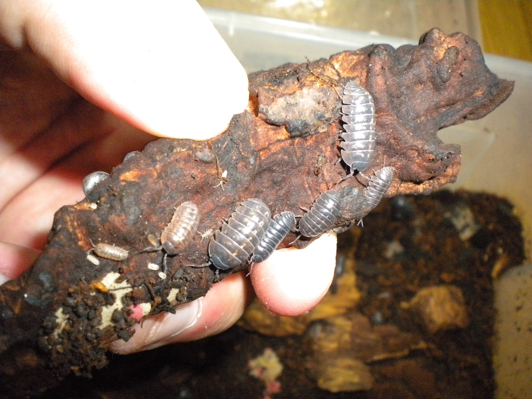 Al principio empece con ellas porque queria criarlas para complementar la alimentacion de mis anfibios,pero no resulto,aun asi,cuanto mas tiempo pasaba mas me gustaba mantenerlas(aunque realmente se mantienen solas).Son simples cochinillas con colembolos(estos ultimos para eliminar cualquier resto de comida que pudiera quedar y eliminar los hongos),aunque me gustaria que me concretarais la especie.Ahi van las fotos.