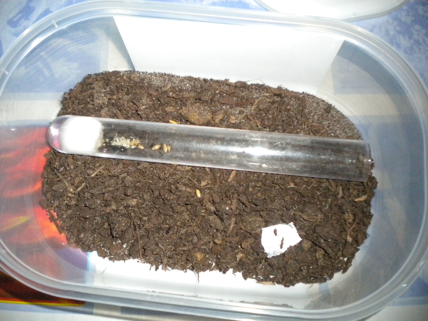 Ahi va la colonia de Messor barbarus que mejor esta avanzando,si os fijais en la segunda foto,aunque se vea fatal,se ve una pupa gorda de color amarillento,sera el primer ``major´´ o cabezon de todas las minicolonias que tengo.