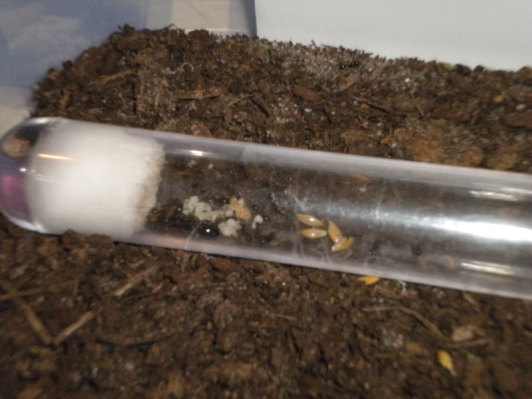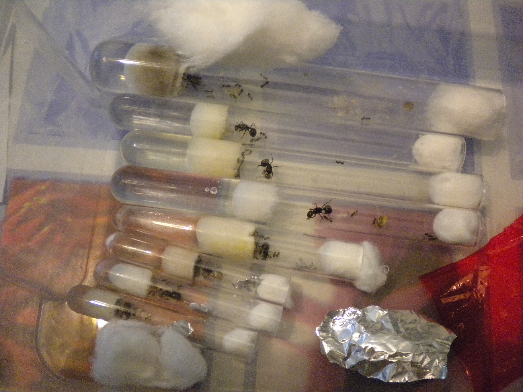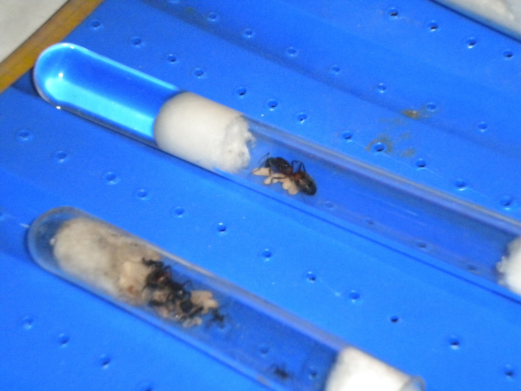 Las otras dos fotos son de las minicolonias que tengo en tubos de ensayo,son Messor barbarus,y Lasius sp,puede que niger,grandis,o puede que ninguna de las dos ;)
