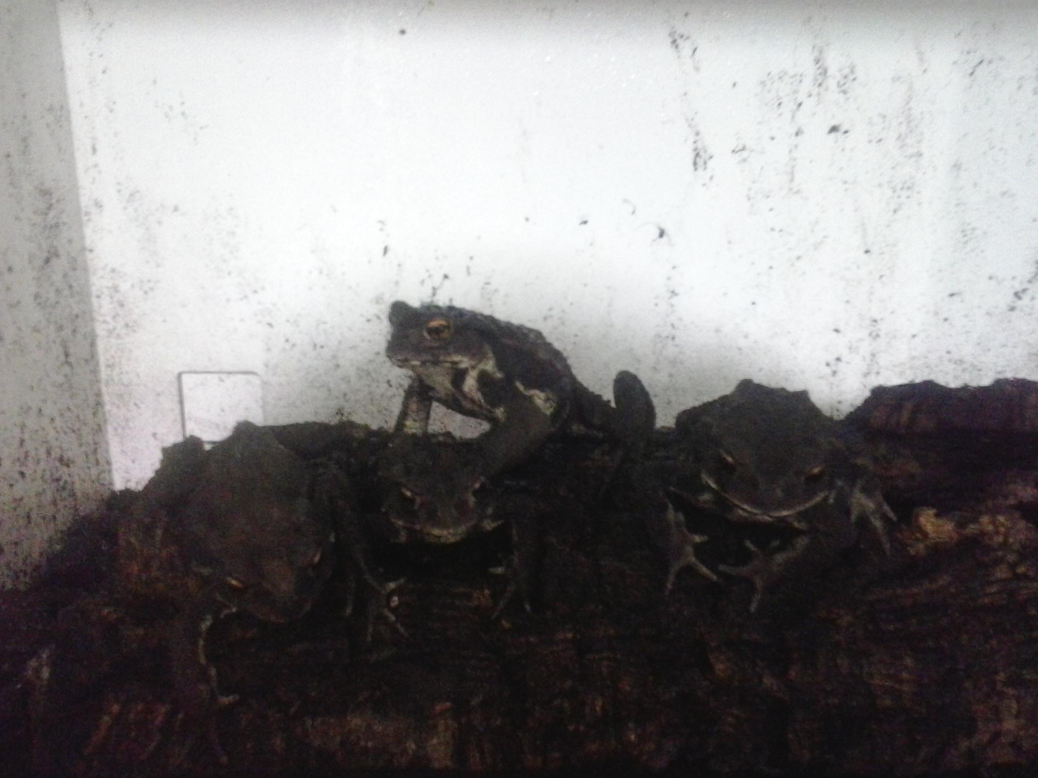 Uno de los ejemplares rehúye la comida desde hace unas semanas y, durante las contadas ocasiones en que intenta atrapar un gusano, no puede sacar bien la lengua. Además, permanece todo el tiempo enterrado. ¿Sabéis a qué se puede deber? El resto de los sapos, por contra, devoran todo lo que se pone a su alcace.