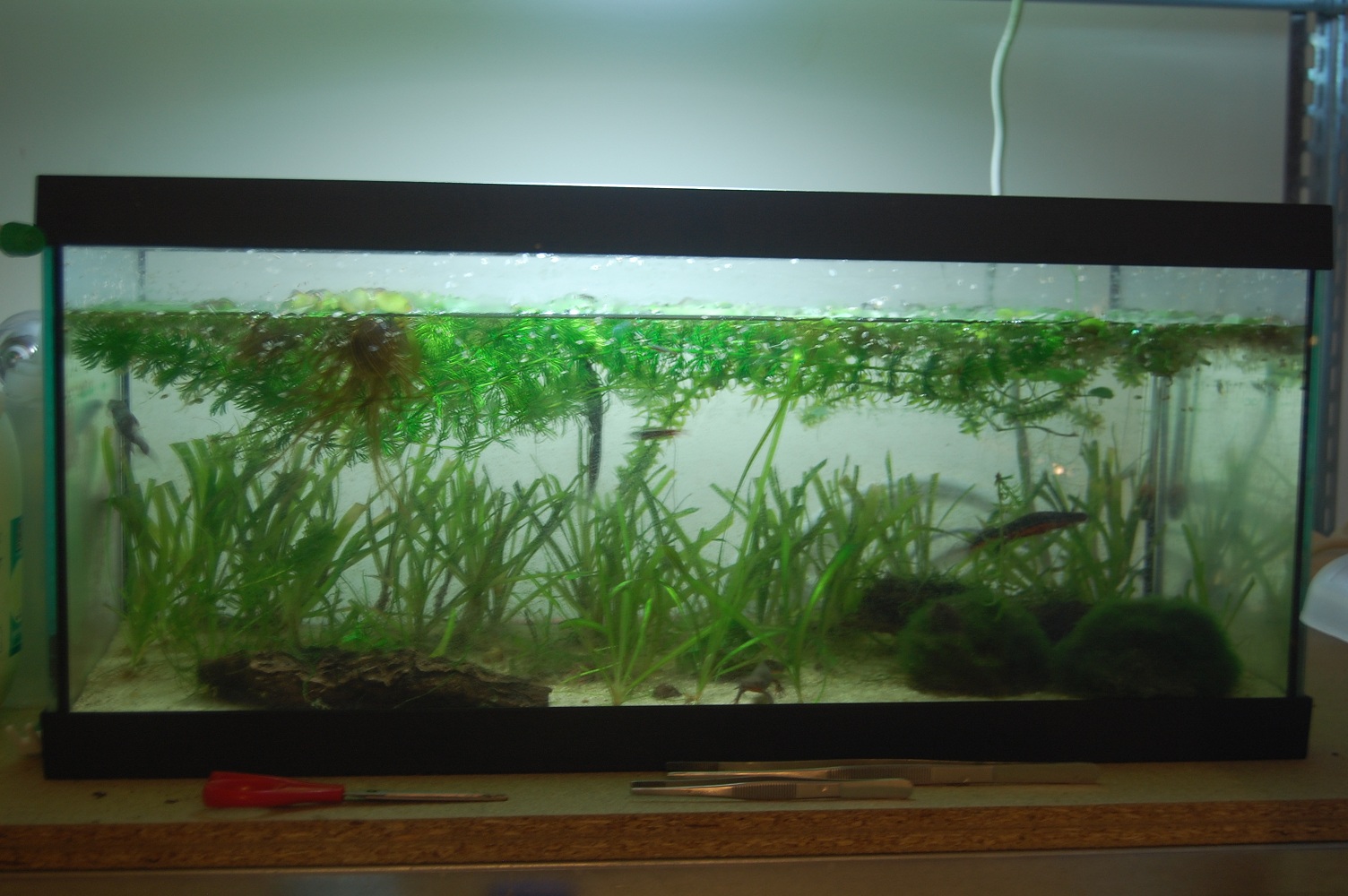 Primero dos fotos del acuario del dobro antes de rellenarlo y antes de quitar todo de la estanteria para sacar las fotos :p una de la estanteria,y una del acuario de los H.orientalis,la cola de zorro va tirando en este.