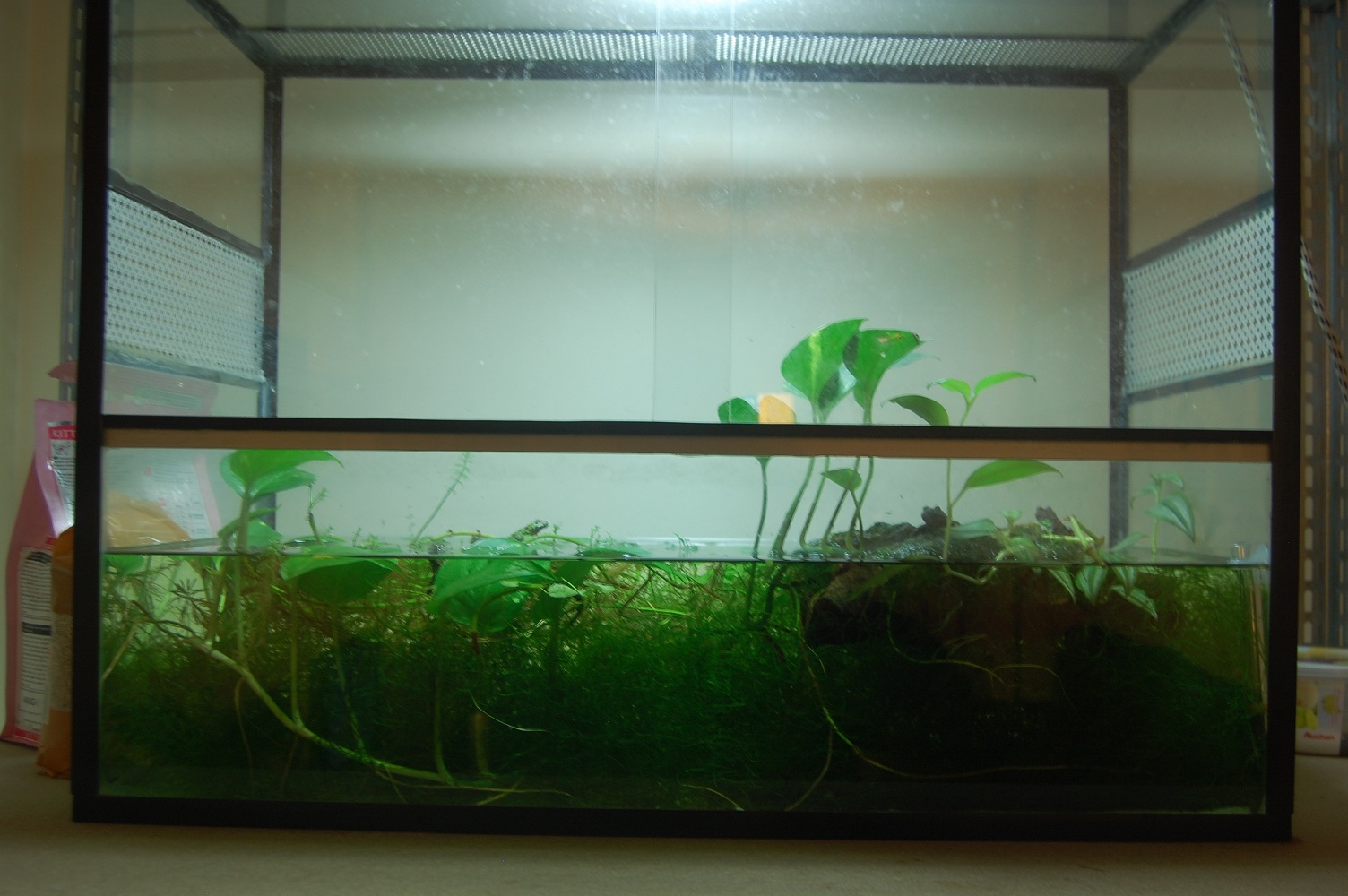 Madre mia,como se te dan las plantas por ahi.Espero que no se mueran las ramas de bacopa al haberlas sumergido.El Pothos que tengo en el acuaterrario de las ranas esta agarrado al corcho,cuando ha ido creciendo,hasta que las raices han crecido lo suficiente para poder emerger de nuevo las hojas duraban un tiempo y se pudrian.La verdad es que de este esperaba que creciera mas rapido.Saludos.