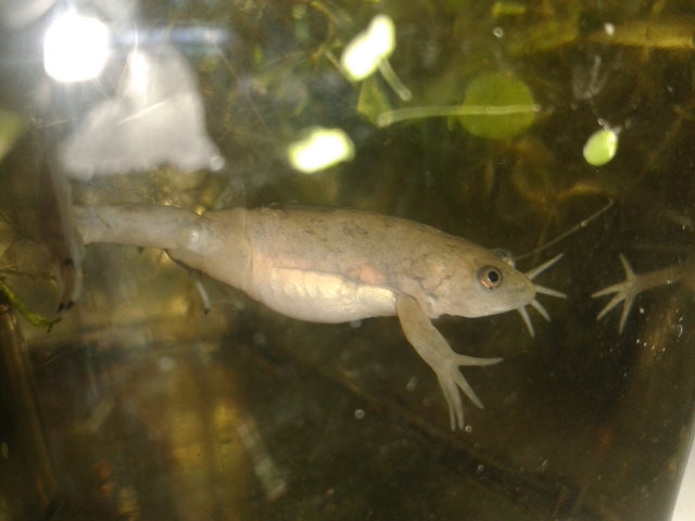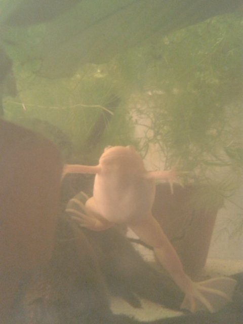 Un trío de las albinas con el tamaño adulto, en una foto hay el detalle de las callosidades oscuras en la parte anterior de la mano y antebrazo de uno de los dos machos. Están en un tupper de 100L con plantas en macetas y flotantes con un filtro sencillobde esos que van con bomba de aire.