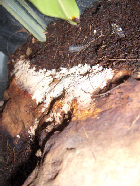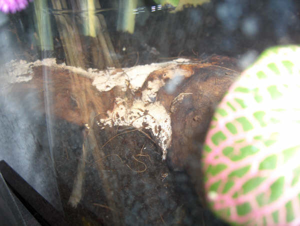 En el suelo de mi terrario de agalychnis tengo un tronco de mopami (creo) semienterrado en el sustrato, y le ha salido uns especie de manchas blancas.