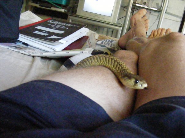 Cuando se tienen cobras entre las piernas, pasa lo que pasa,,, en la foto aun tiene la marca de la boomslang y ya tiene otra especie por las piernas....