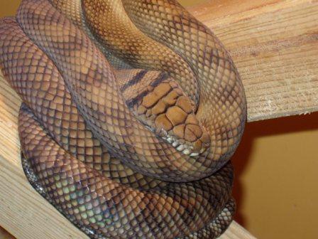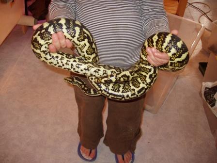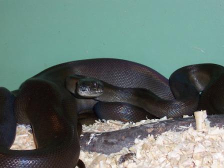 La 3ª es una Morelia amethistina, la preciosa e imponente Pitón amatista, en este caso es un ejemplar no australiano, a mí me parece de la fase o "localidad" barneck, son originarias de Nueva Guinea, y vienen generalmente salvajes de importación, aunque ya comienzan a abundar las nacidas en cautividad. Estos animalitos crecen sin problemas hasta los 3 m., incluso con tallas adultas superándolos hasta los 4 m., o más, algo a tener en cuenta, dado su carácter tan majete.