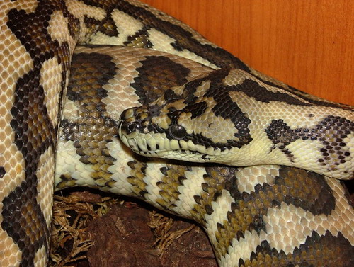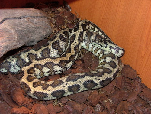 Una foto de la hembraza de Morelia cheynei, está que parece una morcilla de Burgos, y eso que no prueba bocado desde mitades de Octubre. Como podeis ver, está feorra de color, bastante oscura, lo cual es propio de la temporada de gestación, y ya no se enrrosca apretadita como suele hacer, sino que se hace un 8 desparramado, la barriga empieza a apretar.