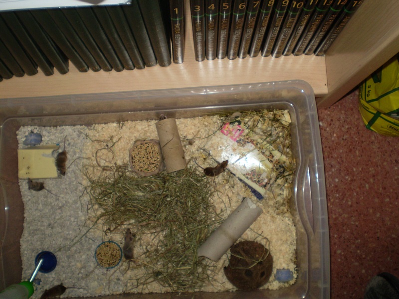Hola, los tengo en un cacharro de esos de plastico que sirven para guardar la ropa debajo de la cama, que son muy largos pero poco altos. Y les tengo puesto tres tipos de sustratos, viruta, heno y arena de gato, entonces cuando la vituta y el heno se juntan se hace como mas consistente y hay es donde se hacen las madrigueras, ademas la madriguera era en un principio una cajita de carton, pero con el tiempo la han ido enterrando y agujereandola y ahora mismo la caja esta completamente enterrada y tiene dos entradas una por delante y otra por detras jejeje son uno maquinas!! Ya subire fotos, a ver si puedo esta noche. Un saludo!!