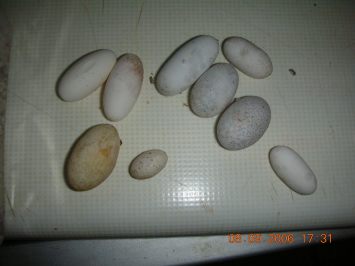 Pues bien, una vez desarrollado este embrion, y completamente formado,estos huevos son menos propensos a abrirse por una veta como en el caso e un huevo liso y despues de supurar vitelio/liquido, y de tirarse un dia "picoteando" la cubierta, el animal muere por asfixa o exhausto, lo que a uno le revuelve las tripas de rabia y pena.