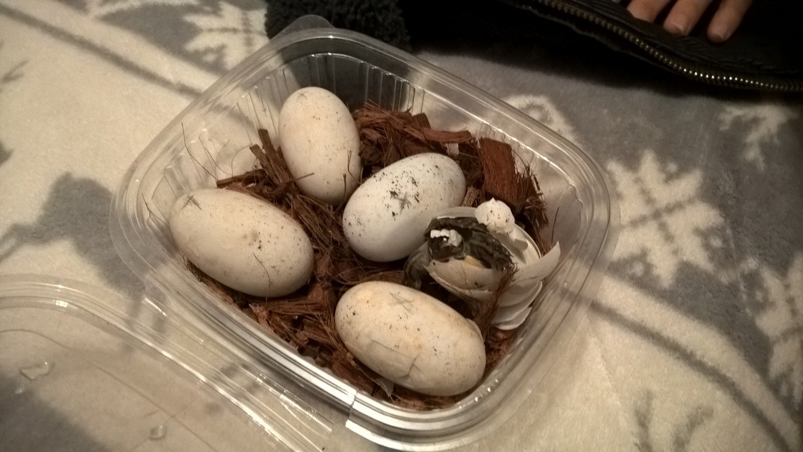 El viernes ya me dije: "venga, que los tiramos." Y al ir a tirarlos me encuentro una tortuga saliendo. Ayer salieron otras dos. Y los otros dos huevos, en uno se la ve moverme por dentro. El otro ni idea pero el color es parecido.