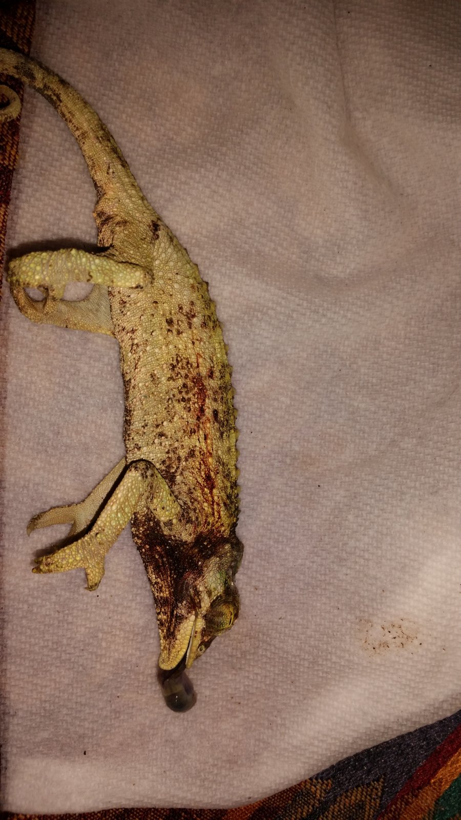 Tengo una Jackson Chameleon y la encontré hoy demasiado vaga, se la pasó durmiendo todo el día y no quiso comer. Tiene 10 meses. Pasé a verla y la encontré en la tierra de su hábitat toda marrón parecía muerta; la tomé rápidamente y reaccionó al tacto, pero no abre los ojos y sacó su lengua, pero sigue moviéndose. Tengo miedo de que se muera tiene todo el cuello negro. Ayúdenme por favor!