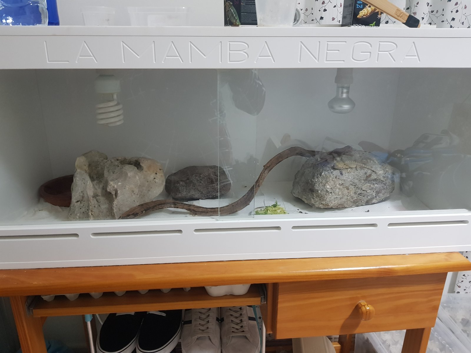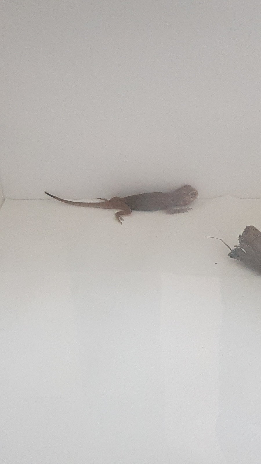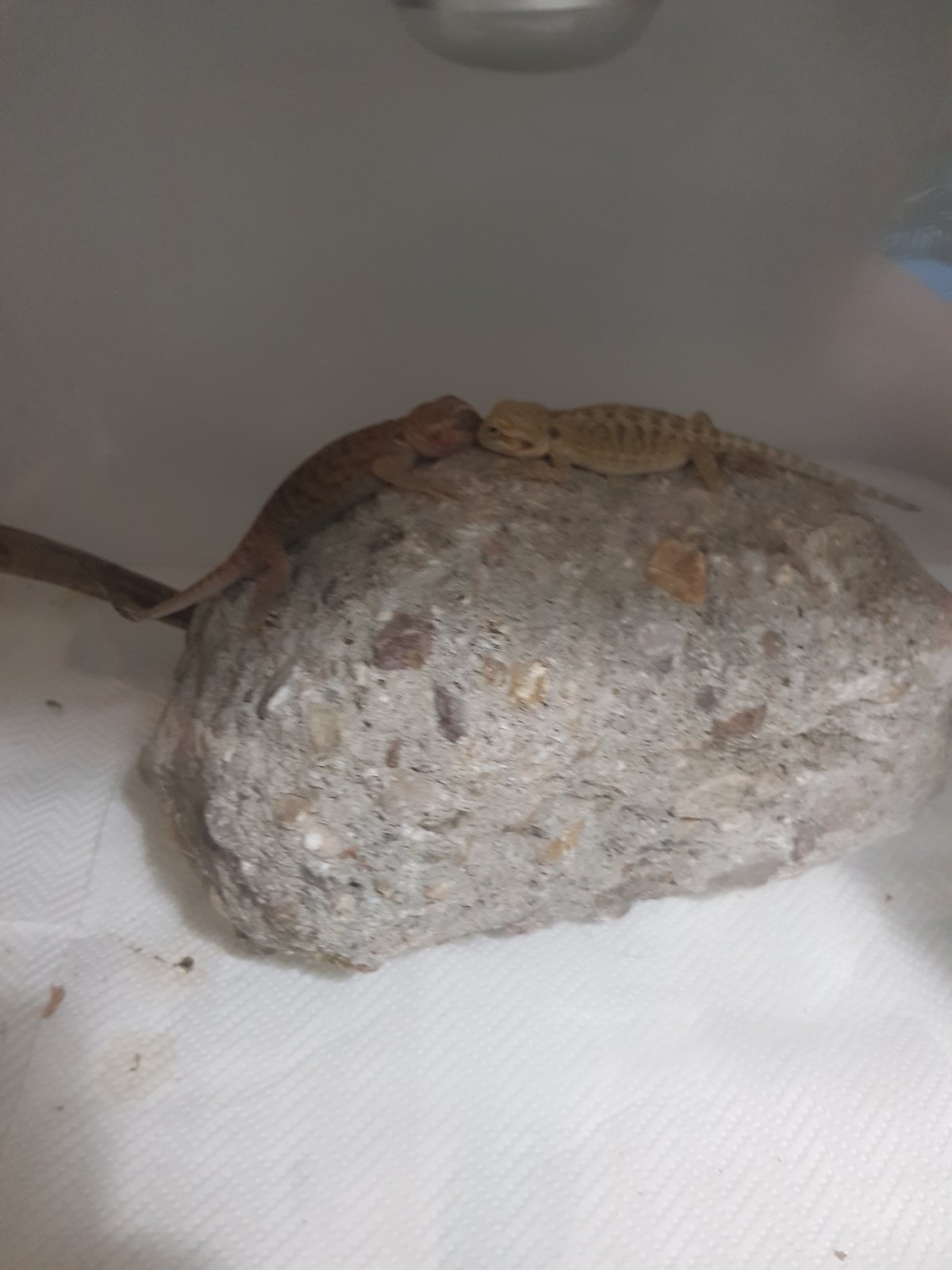 Perdona acabo de salir de trabajar! A lo qe voy,la tengo Junto con otra baby en un terrario de pvc de 1.00x40x40 temperatura cliente 40-45 fría 27-28 y de noche no baja de 17-18....calcio con d3 y vitamina sin d3 le doy,un día calcio otro vitamina descansando un día...comen con pinzas y cuando vino era súper activa pero hoy estaba rara asoleandose con los ojos cerrados y en el baño eso,se giraba sobre ella,y cuando anda es como qe se qiere levantar sobre sus patas de atrás y se cae...y a la hora de comer,siempre se tiraba a la pinza y hoy a base de arrimarle los grillos habría la boca y se los comía...te adjunto foto de sus bombillas,el terrario,con la otra qe esta y de como vino su cola al llegar...