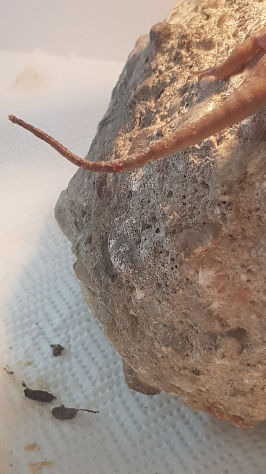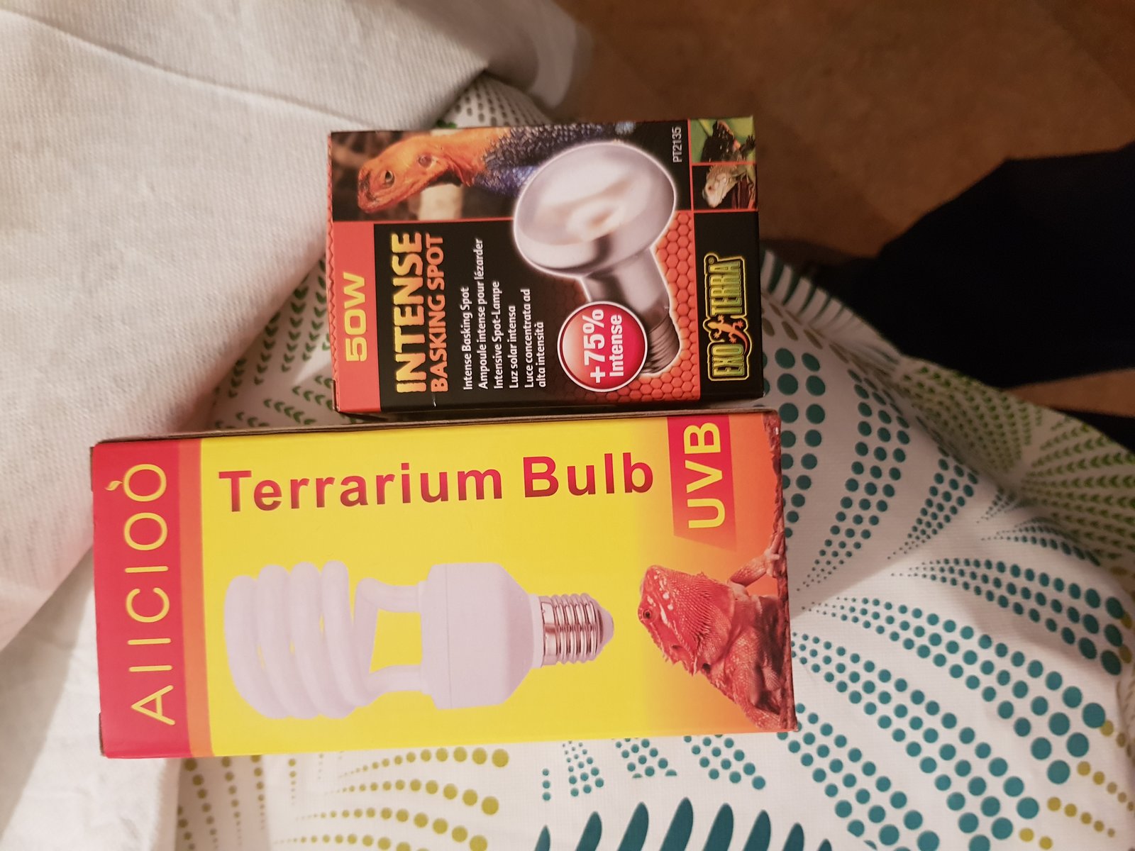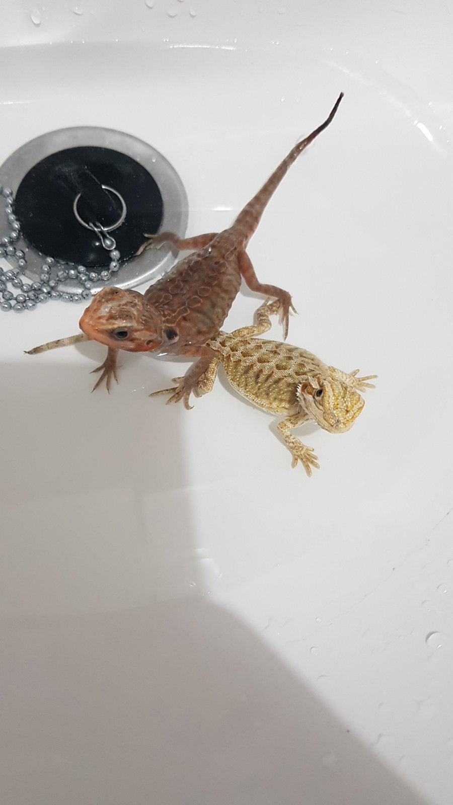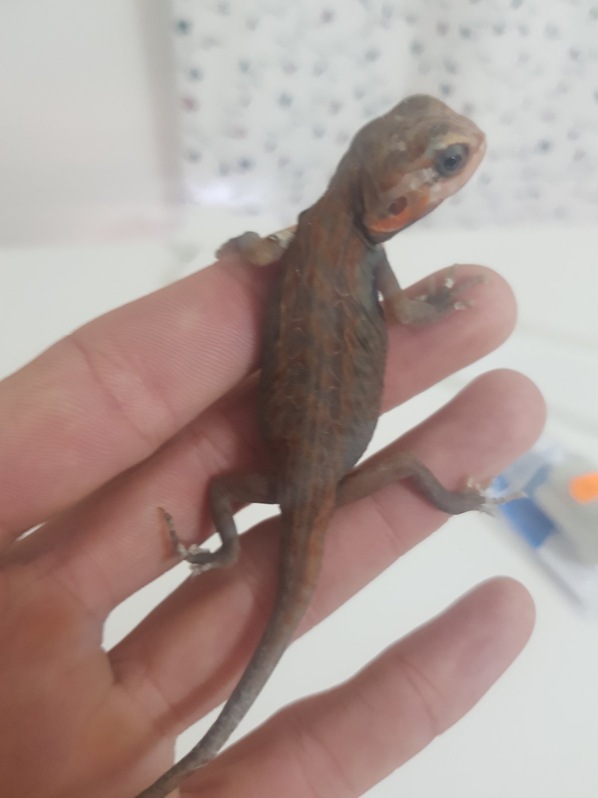 Perdona acabo de salir de trabajar! A lo qe voy,la tengo Junto con otra baby en un terrario de pvc de 1.00x40x40 temperatura cliente 40-45 fría 27-28 y de noche no baja de 17-18....calcio con d3 y vitamina sin d3 le doy,un día calcio otro vitamina descansando un día...comen con pinzas y cuando vino era súper activa pero hoy estaba rara asoleandose con los ojos cerrados y en el baño eso,se giraba sobre ella,y cuando anda es como qe se qiere levantar sobre sus patas de atrás y se cae...y a la hora de comer,siempre se tiraba a la pinza y hoy a base de arrimarle los grillos habría la boca y se los comía...te adjunto foto de sus bombillas,el terrario,con la otra qe esta y de como vino su cola al llegar...