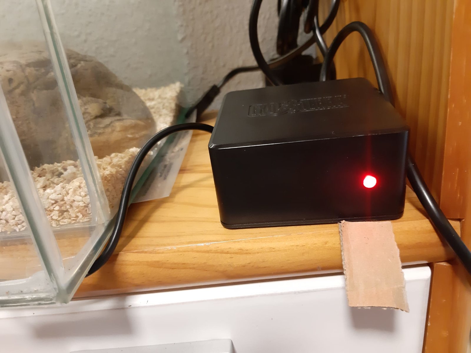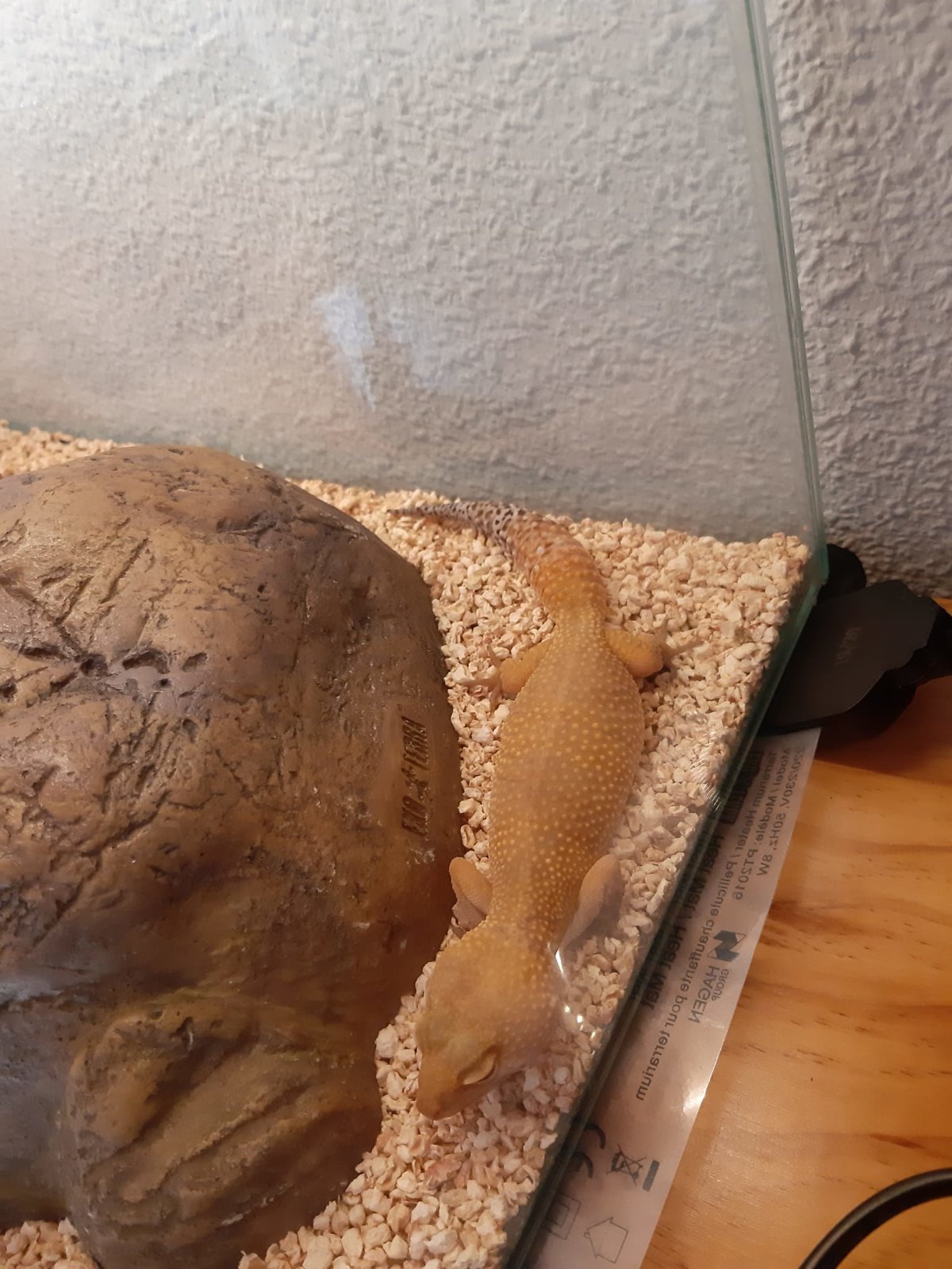 Mi duda viene, más bien, originada por la calefacción de mi terrario. El terrario es de 60x30, he puesto de sustrato lecho de maíz (1-2cm, salvo la esquina fría que tiene más por mera decoración) y tiene lo típico para un euble (comedero, bebedero, dos refugios uno húmedo y el otro en la zona cálida, etc...). Hoy lo he montado todo y he conectado la manta térmica (una 8w de Exoterra 20x20) al termostato de exoterra de max. 100w. Además tengo un termómetro de Reptiland, todo comprado en Artroposfera.