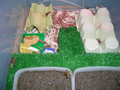 Pongo una Huevera, una fruta y pienso ( de perro ? ) una tapaderilla con tierra cubierta por una tela metálica, y otra con algodón con agua...