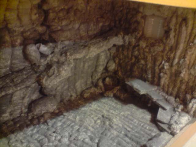 Lo pense, pero no queria quitar la forma que tenia. Ademas, supongo que de la expansion o el peso de la espuma, los cartones que me sirvieron de plantilla se deformaron (2 de ellos), y se me vinieron alante. Aquello era imposible de devolverlo a estar pegado a la pared del terrario, al menos con nada que no implicase taladrar el terrario para poner algun tipo de agarre.