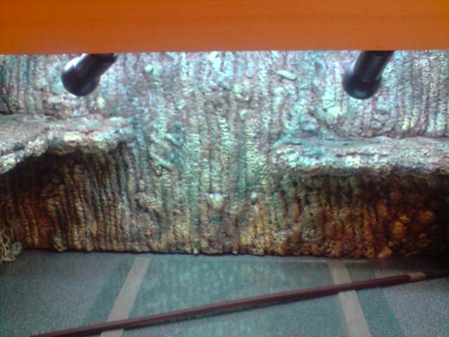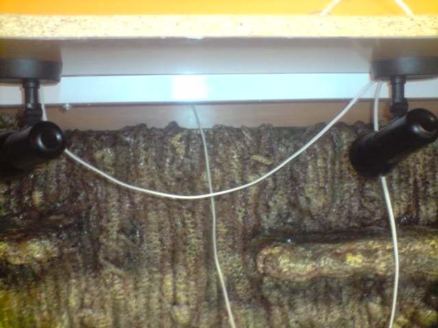Los dos cables saliendo por la pared del fondo del terrario, por la parte de arriba, para que no esten muy a la vista: