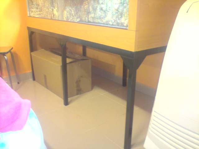 Un detalle de la parte de abajo del terrario y la mesa... mande que le hicieran varios travesaños con idea de que apoyase bien la madera y no se convara ni nada de eso con la decoracion y demas. Las patas tienen todas una "escuadra" en las uniones para que no se abran, y las patas tienen terminaciones de goma para no arañar y poder arrastrar un poco mejor el terrario si hiciera falta. El hueco inferior es todo diafano para colocar las cosas del cuidado de los animales. Bien pensado ehhh? jeje