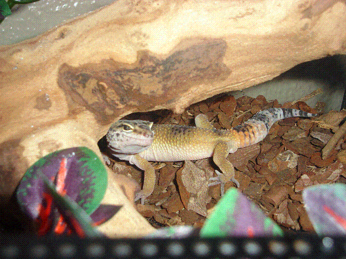 Os cuento, hace 3 días me compre mi primer gecko leopardo, unos 5 meses, junto con una manta eléctrica 28x15,puesta en la mitad del terrario, con una luz fluorescente 15w 9000k 2% UV-A, Y un 0’5% UV-B, y un terrario que me regalaron, 50ANCHO x 25FONDO X 40ALTO, con un termómetro (tipo pegatina negra, iluminándose la temperatura que esta, como la de los acuarios), utilizando arena de minerales de alta calidad (arena negra con partículas blancas) en la tienda me han dicho k no es la arena de acuario y que si se la come es digestiva sin producirle daños, y sustrato natural (pino, abeto, coco y haya), que mantiene la humedad, pero no se exactamente cual tendré. Estos sustratos los tengo mitad y mitad, decorado con un bebedero, unas plantas de plástico, una piedra y un tronco; también le puesto una tapa de mermelada con calcio. Utilizando para la manta eléctrica y el fluorescente un termostato para controlar el tiempo (12horas encendido de día y otras 12 horas apagado por la noche).