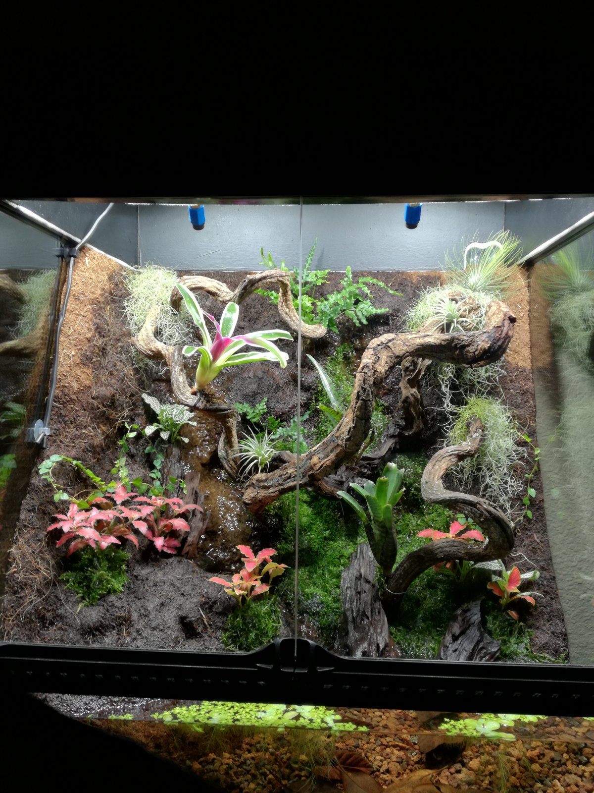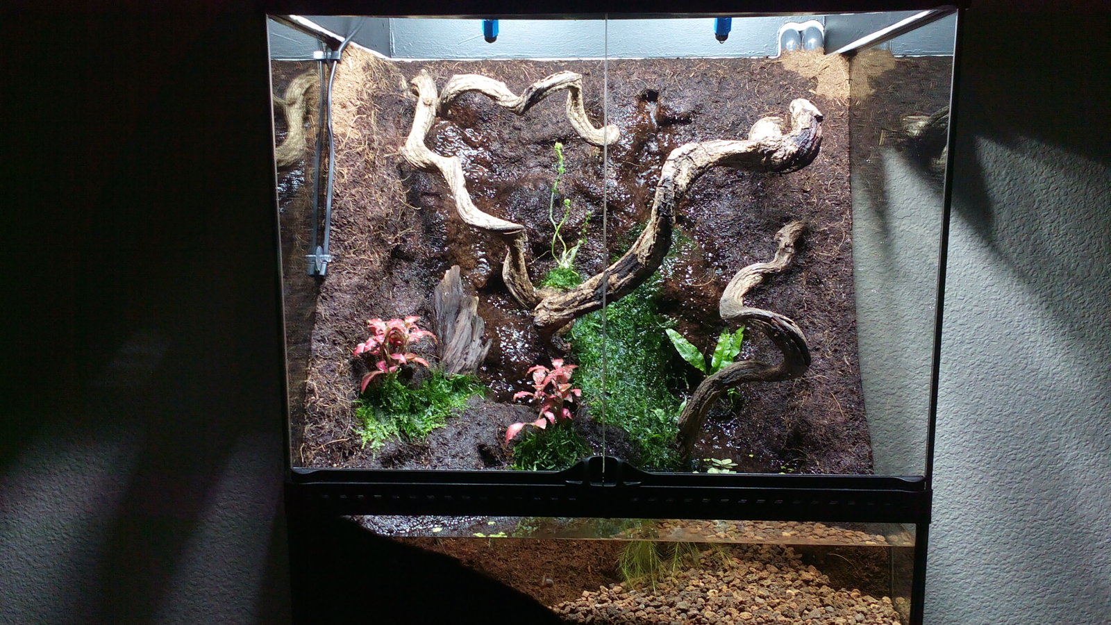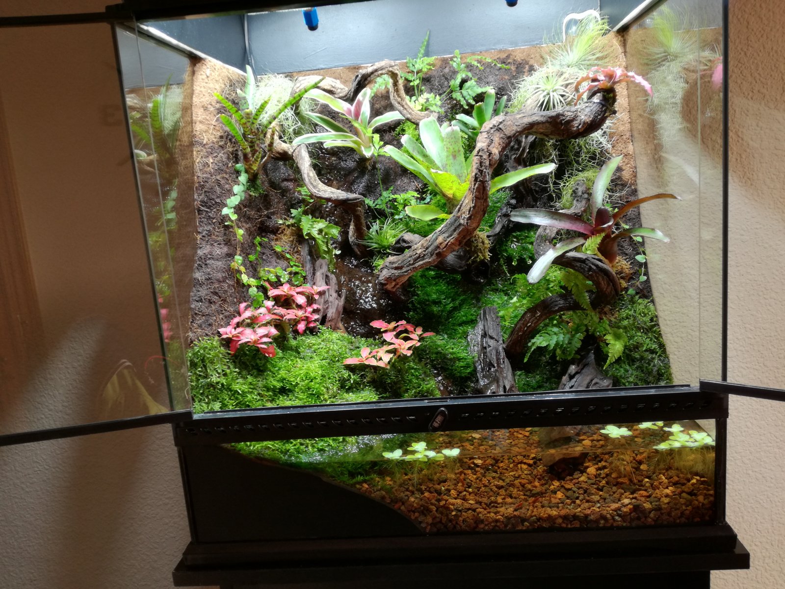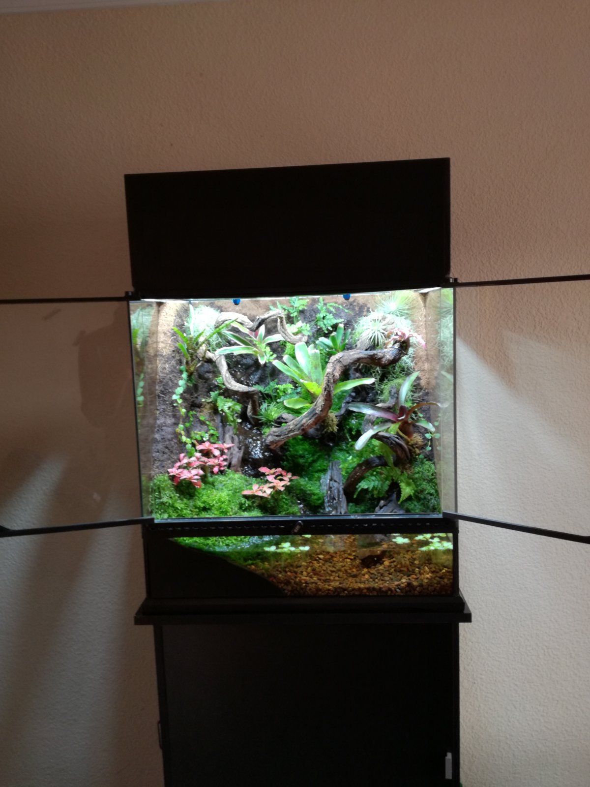la urna que he elegido para mi proyecto y que aun no he comprado (para evitar tentaciones antes de tener todo el equipo necesario) ha sido una exoterra de 60*45*60, el motivo principal ha sido porque voy a poner una parte acuatica, esta va a estar compuesta por cascada, riachelo y charca.