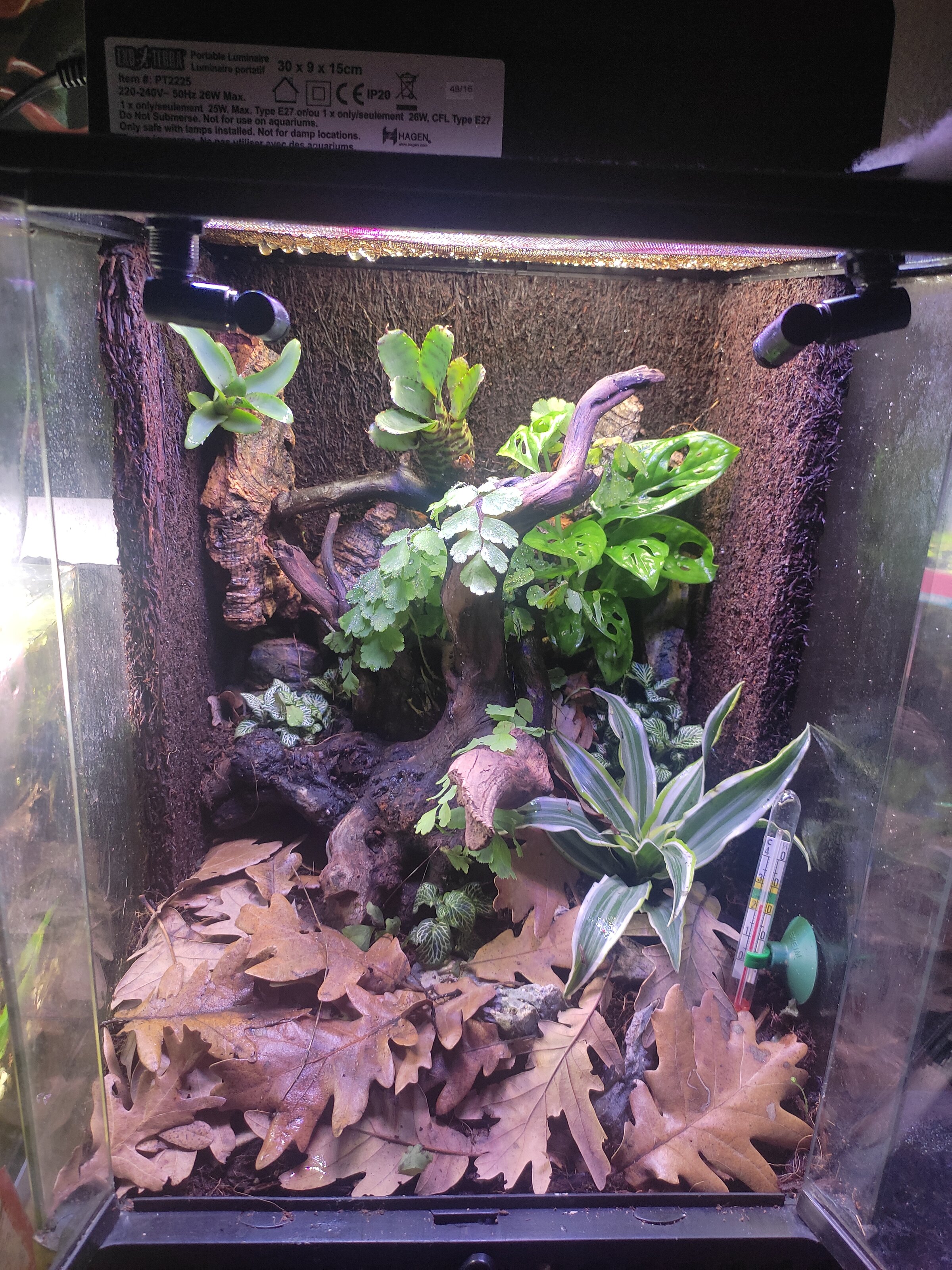 El terrario es un ExoTerra de 30x30x45, con manta térmica que me mantiene el terrario a unos 26°C, sistema de lluvia SMART (del Aliexpress, pero funciona bastante bien, llevo madurando el terrario un mes y medio aprox y no me ha dado problemas). Como drenaje le tengo puesto un cacho de manguera enterrado por el que meto un tubito y con una pera vacío una vez a la semana más o menos. Ahora mismo tengo puestas dos boquillas de lluvia con intervalos de 15 segundos cada 4 horas, ya que poniendo una sola boquilla no se me llegaba a empapar bien el xaxim. El fondo y la mitad de los laterales están forrados con placa de xaxim. La humedad está entre el 80% y el 95%. Toda la base de arlita, con malla separadora y de sustrato mezcla de fibra de coco, un poquito de humus de lombriz y chips de coco, con una buena cama de hojas de roble. Ya hay colonia de colémbolos establecida. De aquí a nada empezaré con los cultivos de drosophilas. De iluminación tengo una bombilla uvb de 25w (sé que las ranitas no necesitan uvb) y un tubo led de acuario.