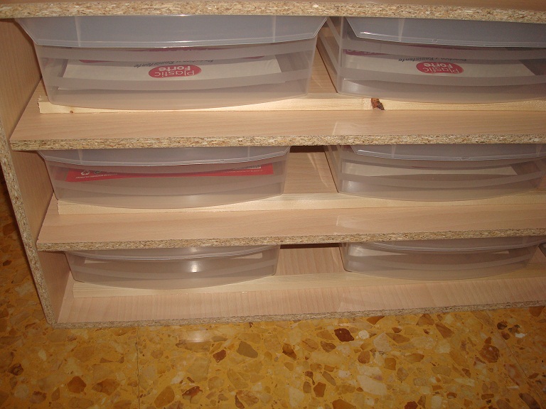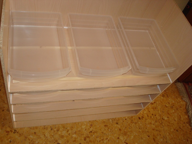 Para ahorrar dinero y espacio decidi construirme un rack. Pense como iva ha plantear el sistema electrico (calefaccion) y para ahorrar tanto en el propio gasto de la compra como en la electricidad decidi usar cable calefactor. En una pagina vi uno de 20 metros y de 50 w. Compre primero de todos los cajones en un chino. Despues hice medidas en papel y compre las maderas en leroymerlin. A cada madera le puse dos listones que ocupaban su longitud, de 1.4 cm de anchura. El efecto de estos es crear espacio entre cada tupper y la base de cada altura. En este espacio pasaria posteriormente el cable calefactor. Luego comprobe que encajaban y puse tuppers y pegaba cada piso. Finalmente puse unos soportes debajo de cada extremo de cada piso para ayudar a sostener el peso y que los cajones sean faciles de abrir para no causar estres al animal.