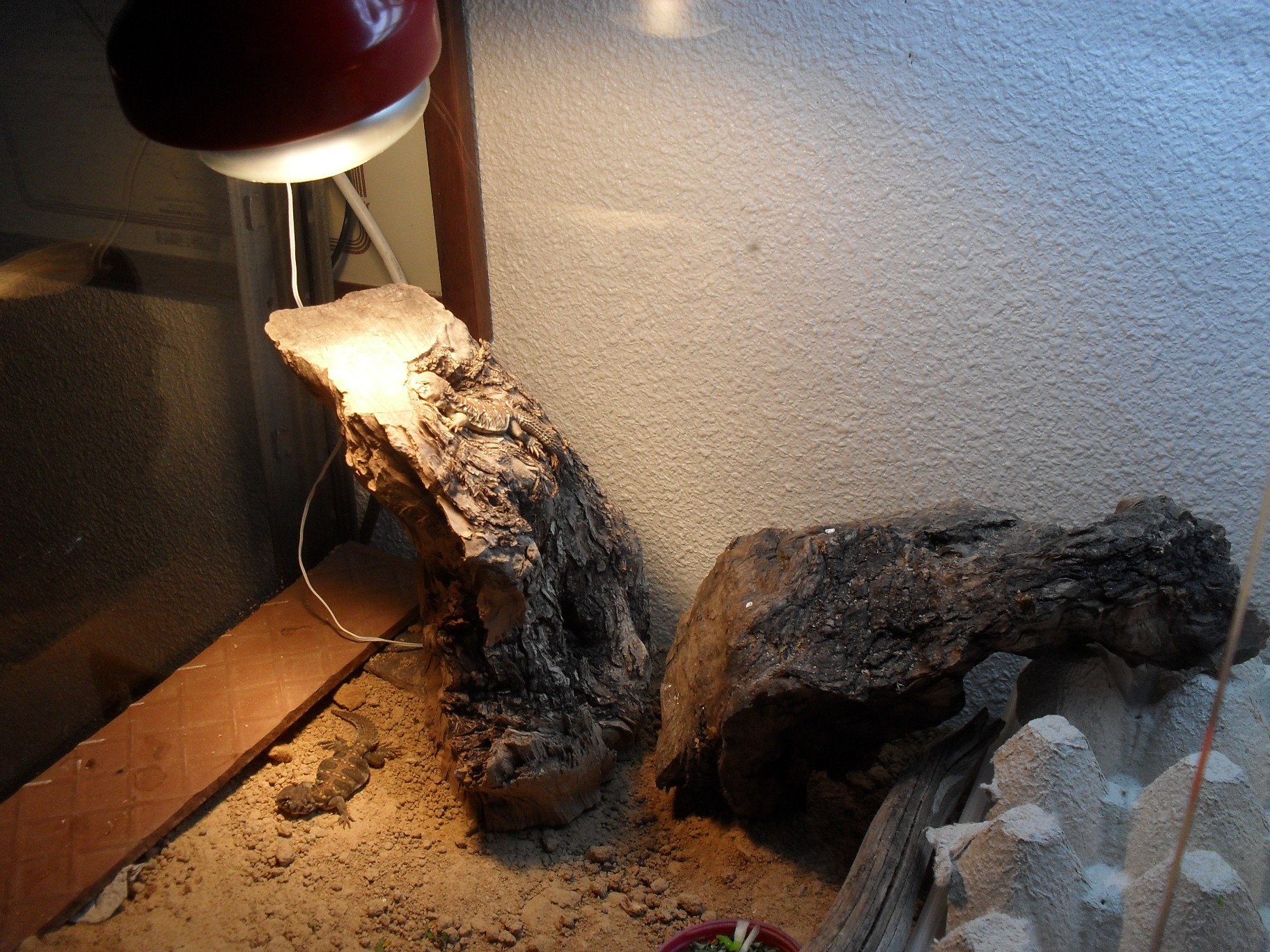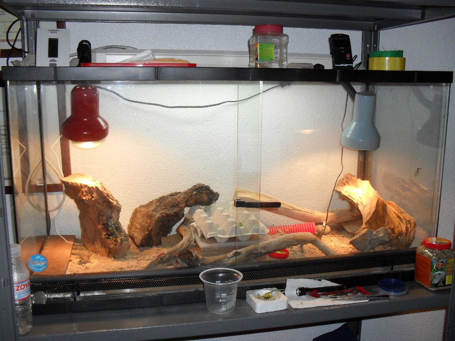 Pues más o menos como lo ves ahí. Pantalla con 2 fluorescentes, y luego 2 spots (en estos momentos de 60w.). Así consigo un gradiente térmico adecuado. Se puede jugar muy bien con el watage de los spots y con la orientación de los mismos. Tienen también sustrato de tierra arcillosa y es divertido ver como debajo de las planchas excavan y se resguardan para dormir. En estas guaridas la humedad es ligeramente más alta. La temperatura/humedad la controlo con dos termómetros/higrómetros. Tienen varios escondrijos, pero les gusta dormir juntos, o al menos cerca. Lo que se ve en el centro es una cámara para posibles futuras puestas (no sé si serán pareja pero como es rápido de hacer, pues se lo hice y pa´lante).
