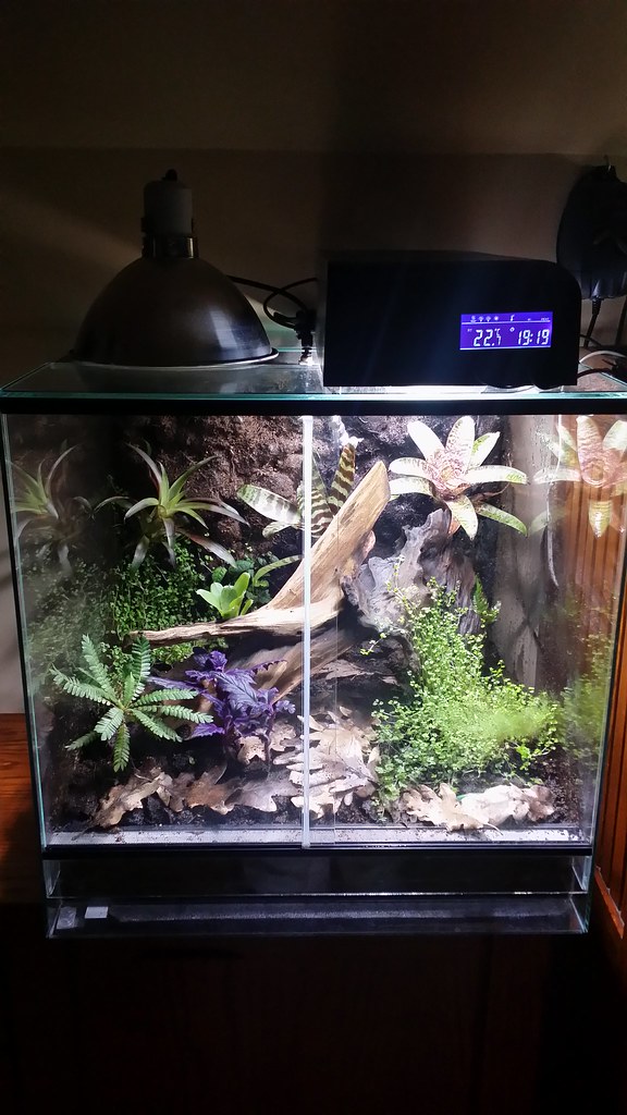 Por ahí andarán mis post donde os enseñé el comienzo de mi terrario, un acuario que pretendía reconvertir. Aún lo tengo, lo acabé bastante bien, excepto la tapa que se me complicó... así que al final me cansé! Compré un terrario especial de dendros de 50x50x50 y todo perfecto!