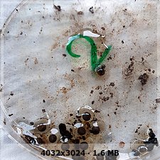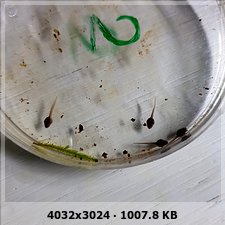 Aclarar que desde el principio del montaje del terrario, ubiqué hasta 3 placas petri escondidas bajo medio trozo de coco, a modo de caseta de puesta; que revisaba con cierta asiduidad. La sorpresa fué enorme, y traté de fijarme a donde quería llevar a su pequeño retoño (aclarar que en el terrario hay un par de mitades de coco que suelen estar rellenas de agua a modo de charquita). Al final del día vi como Jose Luis volvía a entrar en una de las casetas, para abandonarla sin su pequeña carga. En estas que al día siguiente decidí intervenir y sacar la caseta de puestas que, efectivamente, contenia un pequeño renacuajo, el cual decidí ubicar en un chato de vino de plástico con un poco de musgo de java y trozos de hojas.