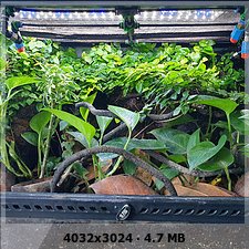 El Terrario es un Exoterra 45x60x60, montado sobre un falso fondo de arlita con su canal de desagüe, su cable calefactor y luego una capa de sustrato compuesta por una mezcla de musgo, fibra de coco, hojas, perlita, arena y corteza pequeña de pino. Aquí hay plantadas varios photos, una pequeña schefflera variegada y distintas cepas de ficus pumila. Encima de todo hay un mix de hojas secas que se van renovando cuando la mesofauna (lombrices, colémbolos, cochinilla tropical blanca y roja y otro tipo de cochinilla del similar al bicho bola, además de algunos pequeños caracoles de los que sospecho quedan pocos por la influencia de las Bicolor) va acabando con ellas. El sistema de riego lo componen 6 bocas ancladas al techo de regilla y una bomba de agua, el sistema de Luz es una tira de leds utilizada en acuariofilia.