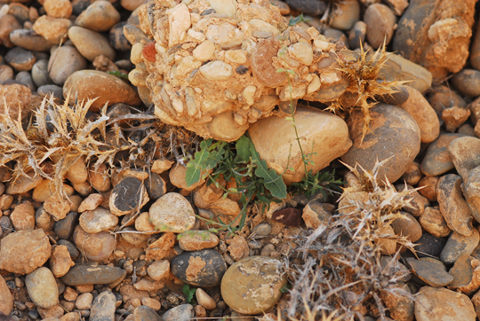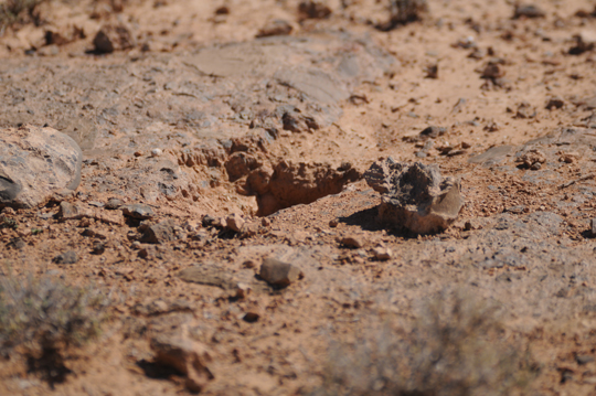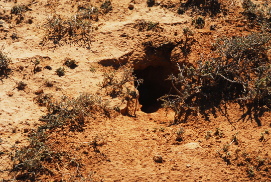 Cobertura de una gran piedra, la madriguera utiliza una grieta de esta.Supongo, solo supongo, que la piedra no rea profunda, y el Uromastyx, solo la utiliza para la entrada. El resto de la madriguera discurre solo en la arena.