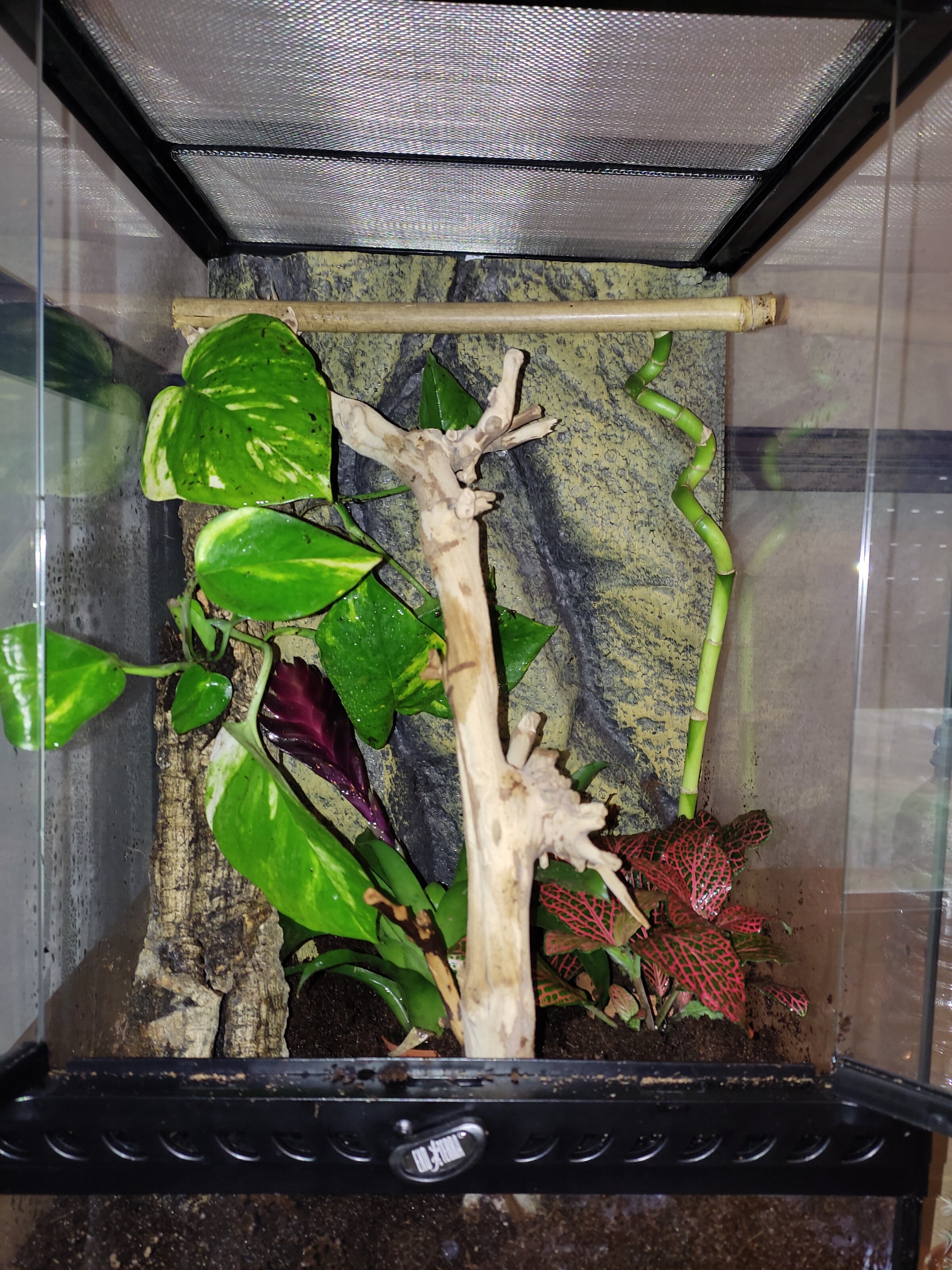 Buenas, abro este post para que me ayudeis con el terrario que acabo de hacer, a la derecha he puesto unas fitonias, en medio una bromelia y las plantas que cuelgan del tronco en la parte izquierda son photos, los cuales he puesto sin maceta dentro de los huecos del tronco de corcho de bornizo, las he dejado con las raíces creéis que aguantarán bien ? Por otra parte aprovechar y deciros que meteré finalmente unos Lugubris, qué opináis ? Un saludo.