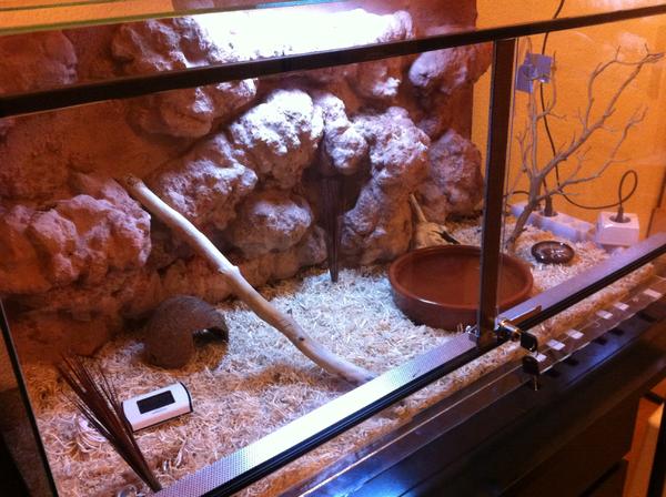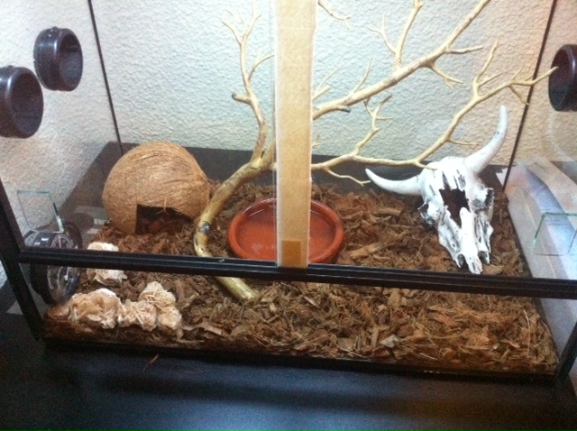 La tenemos en un terrario de 50 cm de largo, dentro de un tiempo sabemos que debemos cambiarla a uno de por lo menos 90cm, pero hay que recuperarse primero de esta inversión xD