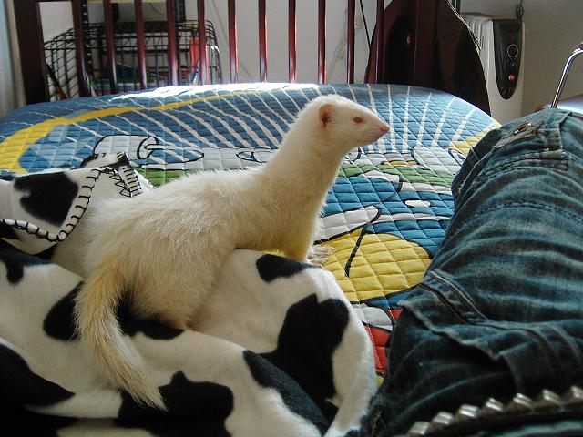 Hola esta es mi huroncita albina, tiene 5 meses y lleva conmigo dos. La primera semana era muy malilla y mordia pero ahora es buenísima, hay que ver como cambian, jeje.