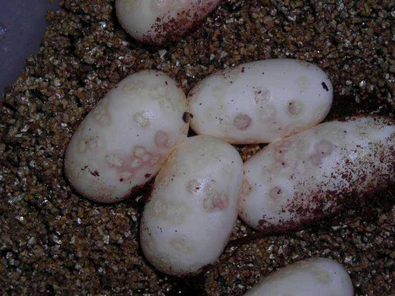 Estos son parte de los huevos de la segunda puesta de una de mis guttatus, supongo que serán descalcificaciones (las que yo habia visto otras veces no han tenido esa forma), pero con el color tan feo que tienen los huevos en general y la distribución concéntrica de las manchas con la zona central como con "plumas" de calcio, me parecen a mi las tipicas manchas de hongos (pero no podria haber salido tan pronto puesto que hace muy poco tiempo que están fuera)... en fin, que a ver que pensais que es, si es solamente descalcificación o hay algo mas. Pongo fotos también de su anterior puesta, que está a punto de eclosionar, para que veais la diferencia con huevos sanos con la misma cámara e iluminación.