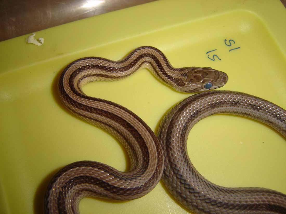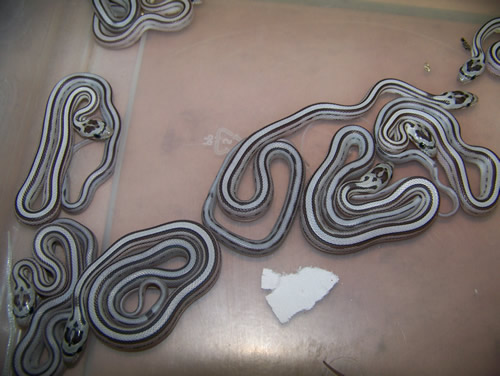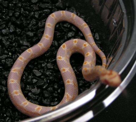 Tenia toda la pinta de proceder de miami y con mutacion anery(la ghost porta anery). El color plateado clarito tenia toda la pinta de proceder de una serpiente de fondo gris limpio sin naranja como son las miami. Muy chulas, pero se trata de mutacion +seleccion, por lo que si se cruzan con otras cosas se pierde la gracia. Han de criarse puras...