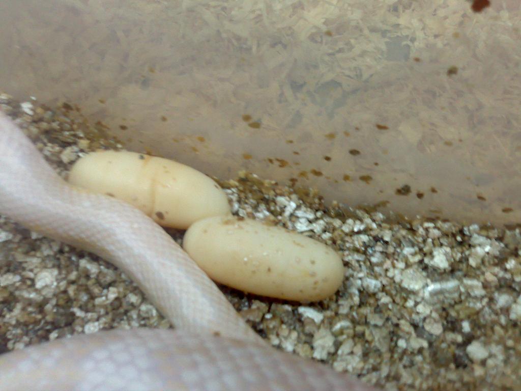 Pues nada acabo de llegar a casa ahora a las 3 y mencontrado que mi snow ha puesto 2 huevos. Nose si es la 1º impresion a no haber tenido nunca pero no me ha echo la muda pre puesta ni nada vamos que yo sepa porque las fechas no cuadran, mañana concretamente hace 28 dias que copuló y la muda la hizo nada hara 15 dias o inclusive mas. Y ahora la chica me pilla en cueros, tengo cajas de polispan sin TAPA con lo que nose como apañarmelas, he pensado en hacer una incubadora provisional en una nevera de camping que tengo pero nose.