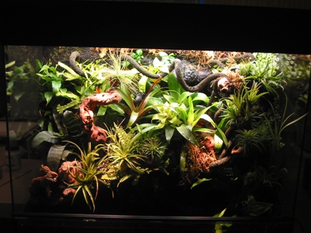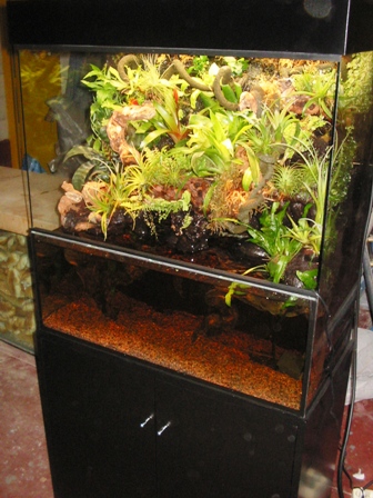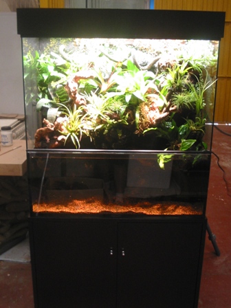Bueno, pues sin inquilinos ya q de eso se encargará su dueño(creo que una parejita de Ambystoma tenía bastantes papeletas). Aunque en la foto no se aprecia demasiado bien, la parte acuatica tiene unos 30 cms de profundidad, por lo que además de para anfibios acuaticos, es apto para peces. En el mueble, va escondido un filtro externo, que sube el agua hasta lo alto del paludario y lo deja caer por el fondo. Las luces, como no, PL. La puerta es de una sola hoja, para no romper la vista frontal.