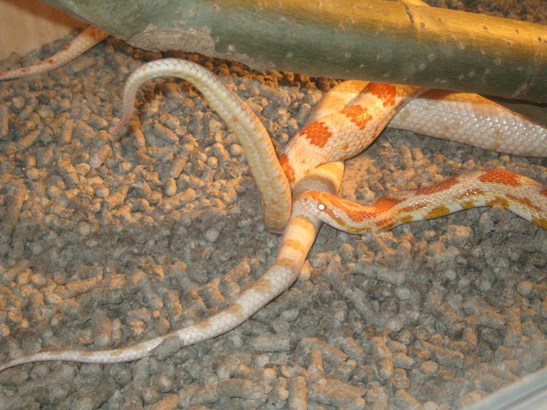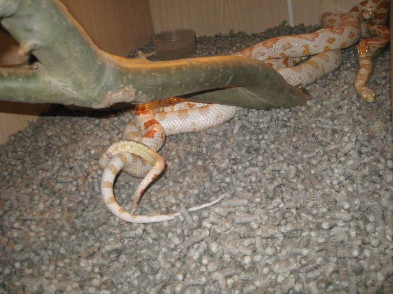 bueno pues despues de un largo tiempo sin guttatas este año me agencie una parejita de candy canes y una hembrita snow aprovechado que un amiguete del foro (güino)tambien tenia el machito aun jovencillo de snow, las candys se que llevan por lo menos una semana copulando aunque no las he pillado con los hemipenes dentro.las snow llevan una semanita y el macho al ser joven no mostraba excesivo interes por la hembra asique hoy he decidido probar y meter las 4 guttatas juntas para estimular al macho juvenil habiendo dos hembras y un rival en el terrario pero la jugada a salido fuera de lo previsto y el macho de candy exausto y seco porque no quiere ni comer solo piensa en meter ha enganchado a la snow ante la ignorancia del jovenzuelo....ya no las he querido separar y ahi van las fotos...(perdon por la parrafada)...saludos