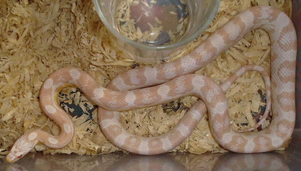 Con lo que se obtienen ejemplares Amelanisticos, practicamente iguales en su coloracion a los demas amelanisticos, pero con la diferecia, de que al tener su forma nominal o salvaje los bordes de las sillas negros, mas marcados y grandes, en la forma amelanistica, esos bordes pasan a ser blancos.
