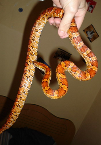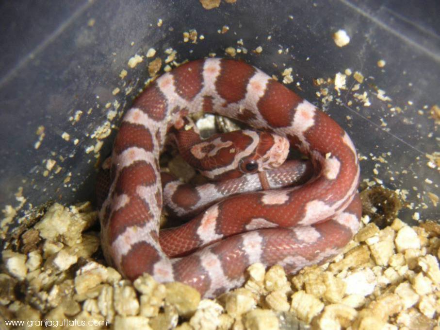 yo expongo aqui mi hembra de guttata albina, mide mas de 1.50m. y los dos años que lleva poniendo huevos la primera puesta fueron 31 huevos y la segunda este año de 27, es una pasada y un buen mastodonte pesa mas de 1.000 g. y en la foto se esta comiendo un perdigon juvenil.-