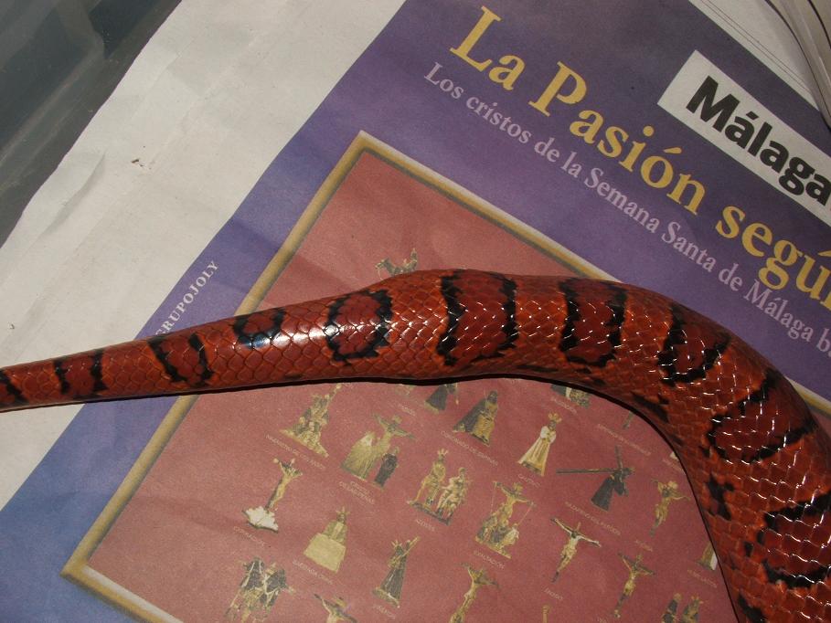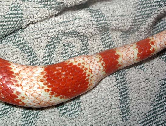 Mira bien la foto para que veas como se acumula la grasa, uniformemente a lo largo del cuerpo y solo se nota, porque al llegar a la cloaca se ve el engrosamiento. pero no es un bulto aislado. Para que te hagas una ideas de porque no creo que la tuya este obesa, la serpiente de la foto comia cada 7 dias lo menos 3 ratones adultos sino mas segun su dueño, y aun asi no llega a tener esa deformidad que tiene la tuya con un raton cada 7-10 dias