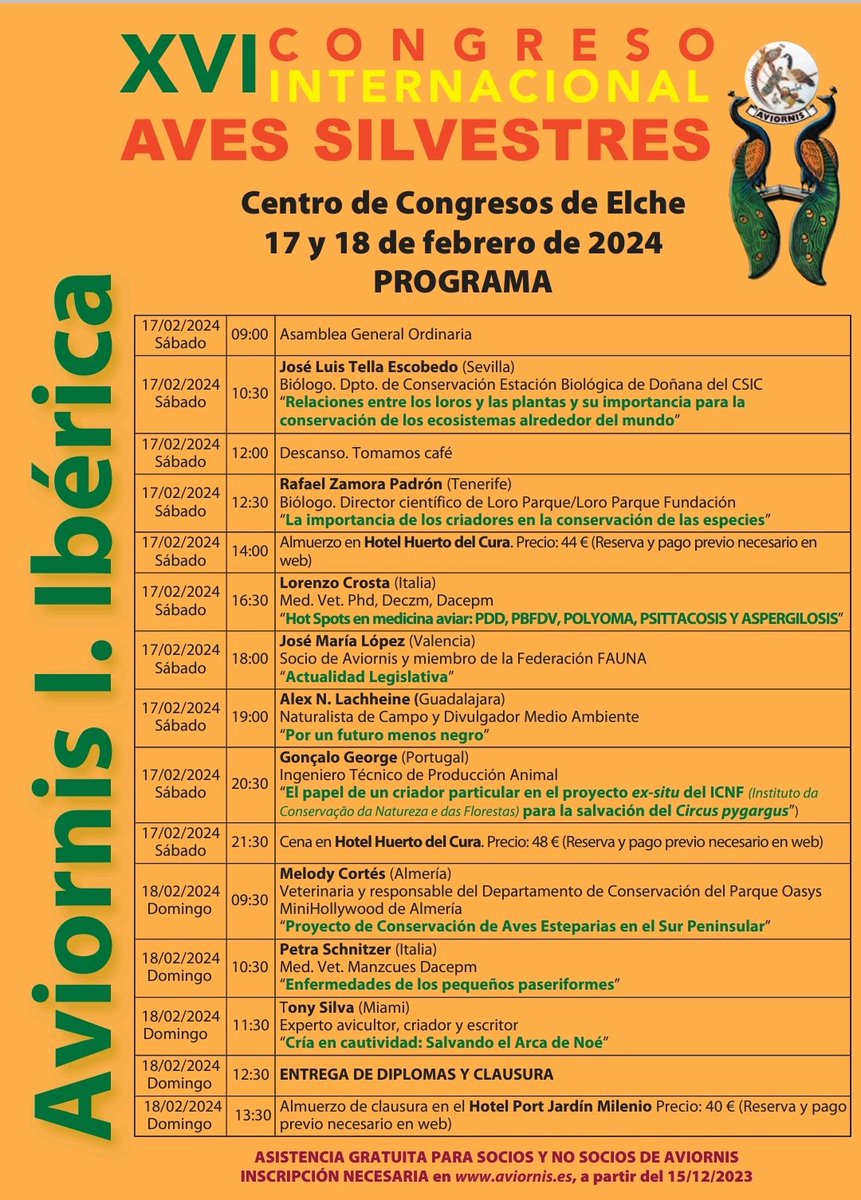 Aviornis, asociación miembro de la Federación Fauna, organiza el XVI Congreso Internacional de Aves Silvestres para los días 17 y 18 de febrero en el Centro de Congresos de Elche, España. El congreso es gratuito pero hay que inscribirse y cuenta con ponentes de altura. Aquí podéis descargaros el programa. Esperamos que no le parezca mal a ningún secretario de Estado o cualquier otro cargo político recién llegado al mundo de la fauna.
