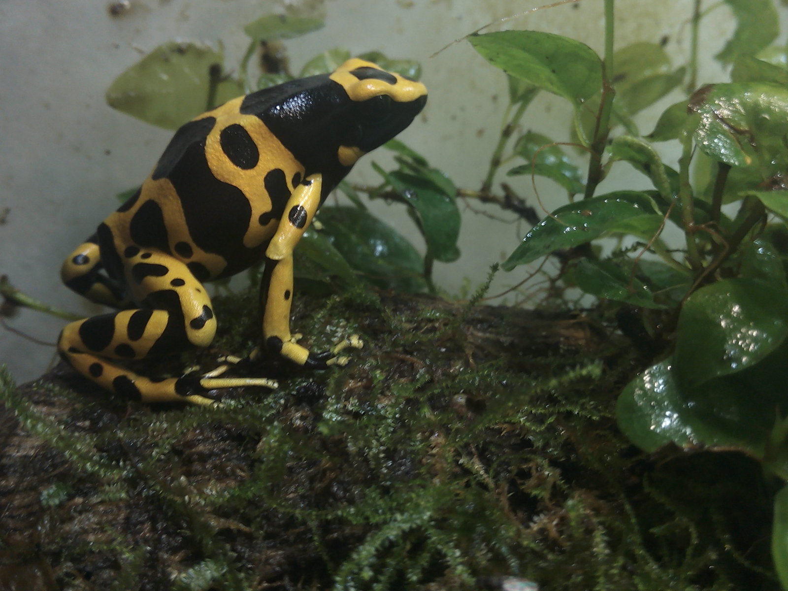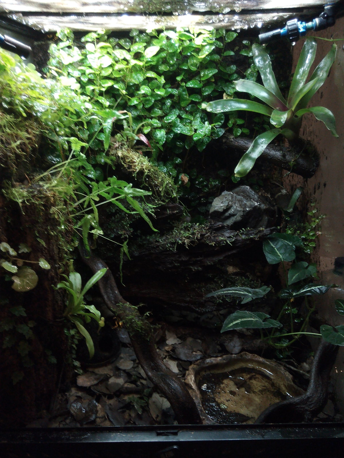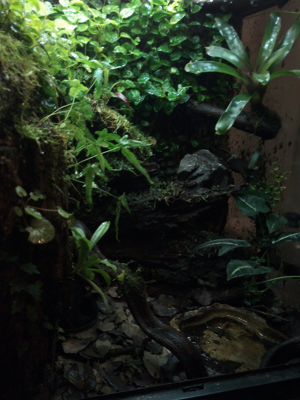 Hola alfredoorata, me alegra decirte que ya come con apetito, quizás no comiese ese día por estar ya satisfecha. En cuanto la humedad, temperatura y alimentación (moscas, colémbolos y vitaminas) son correctos, no se me ha descompensado nada. La he estado observando y parece tener un comportamiento normal y corriente, no se le ve afectada, así que quizás lo que vi del moco fuese lo que has mencionado de la muda de piel que al recordarme lo que le pasó a mis ranas anteriores me alarmé precipitadamente. No obstante seguiré vigilándola. En cuanto al terrario, si es el mismo y no lo desinfecté porque pensaba que en un tiempo que no tuviese habitantes dentro impediría la supervivencia del parásito. Te dejo un par de fotos del terrario y de la rana.