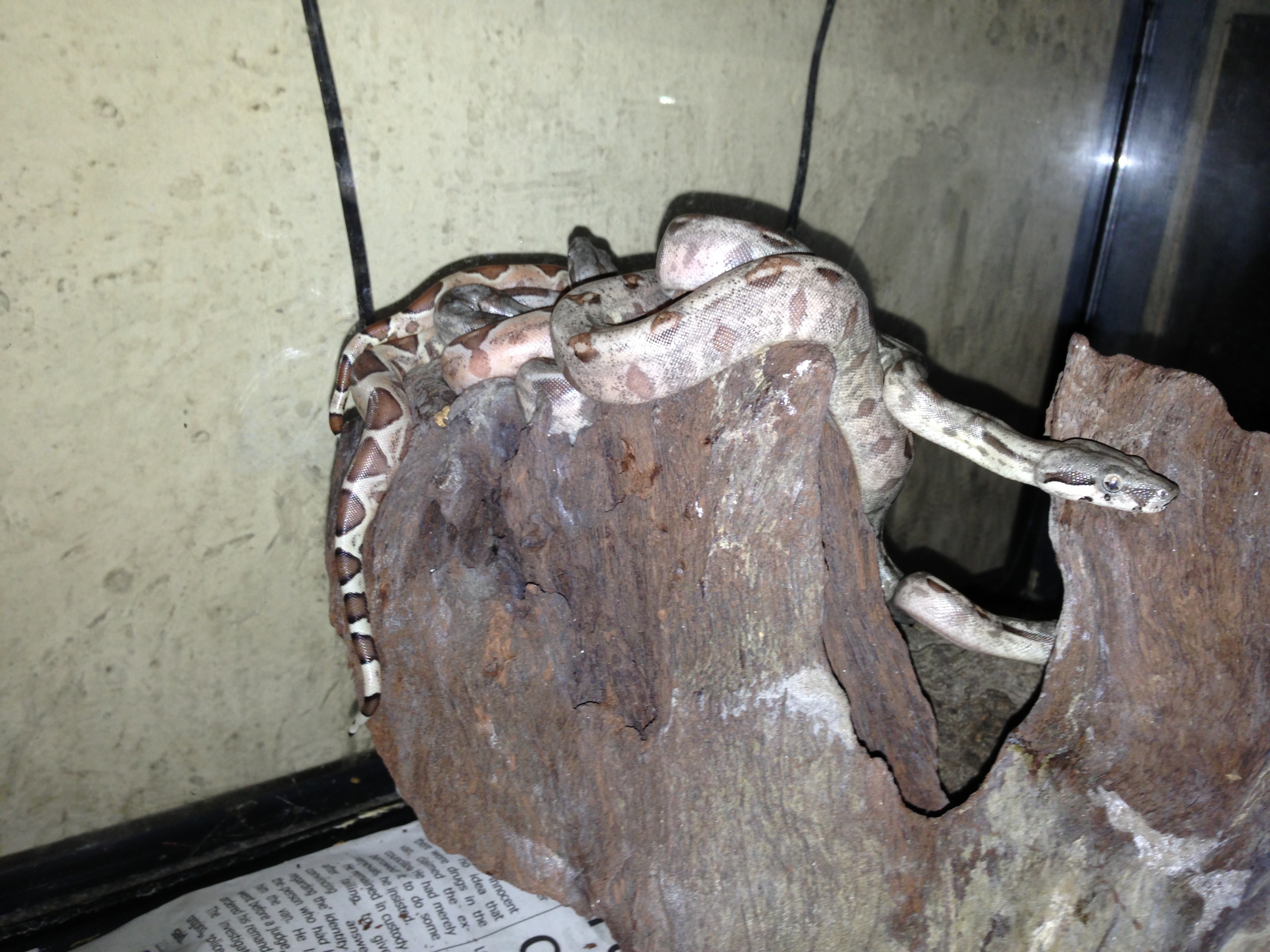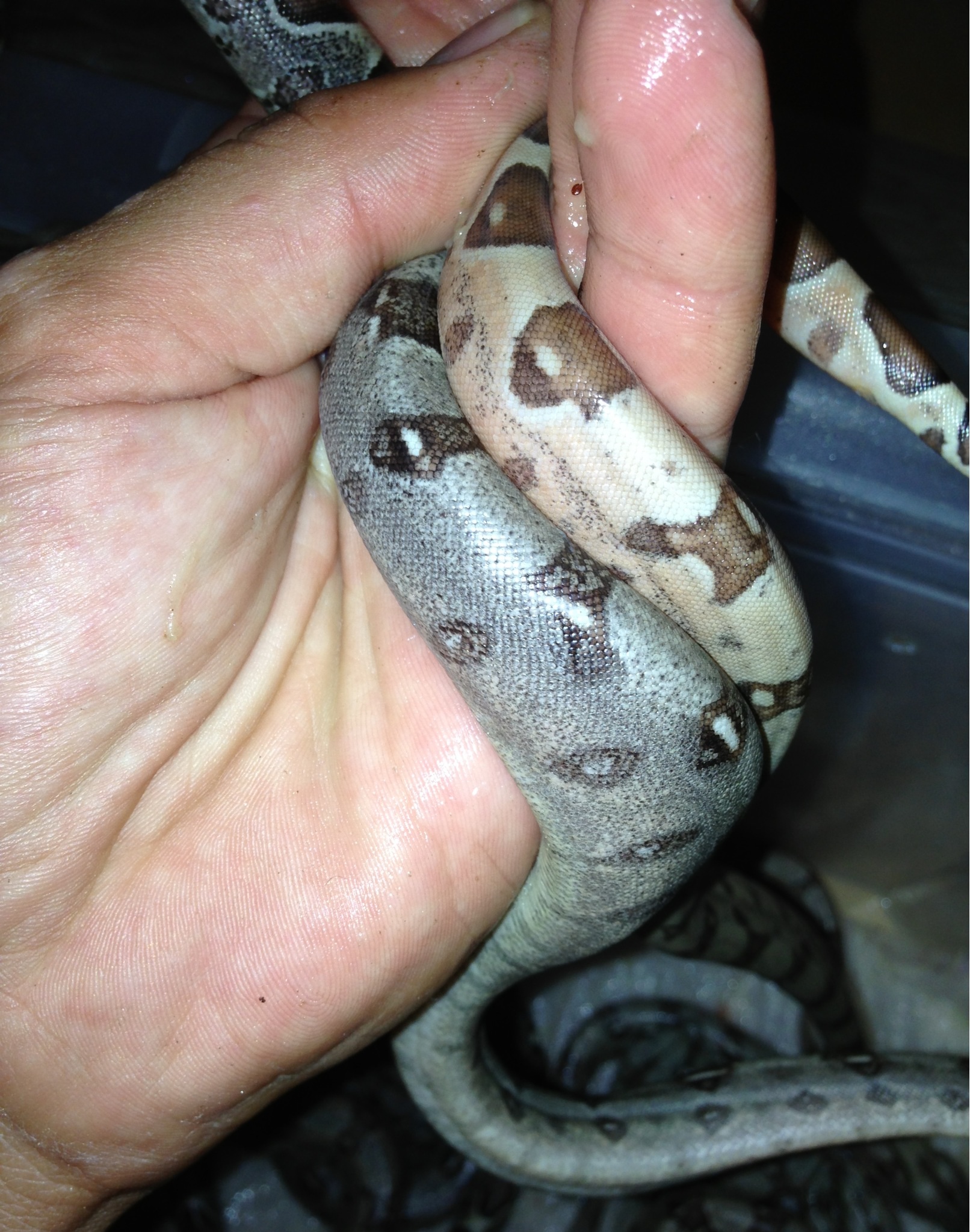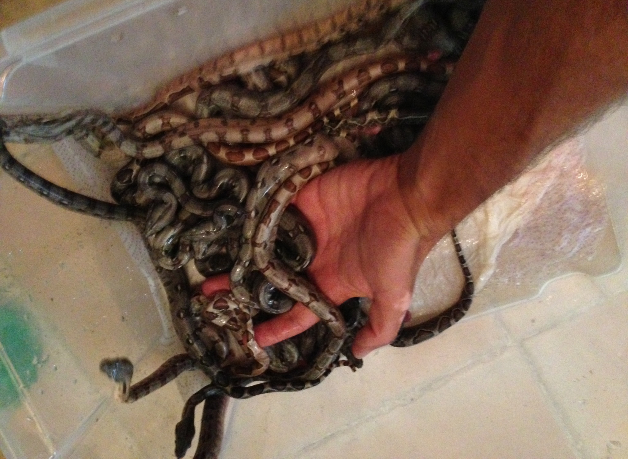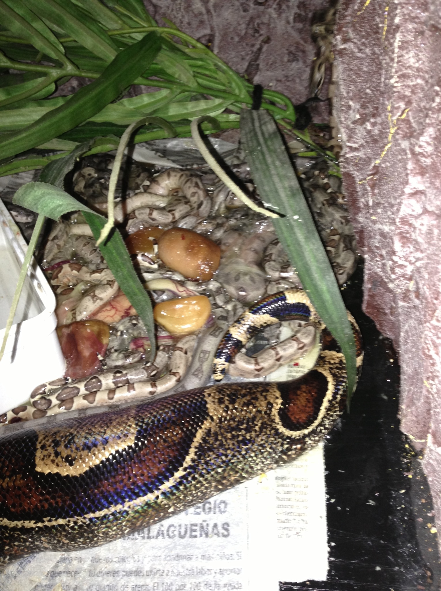 Hola compañeros ayer tras una larga espera empezo a parir una de mis boas,dando 11 crias het.albino y 9 DH sunglow(salmon het. Albino) de linea sharp,os muestro unas fotillo de las pequeñas jejeje